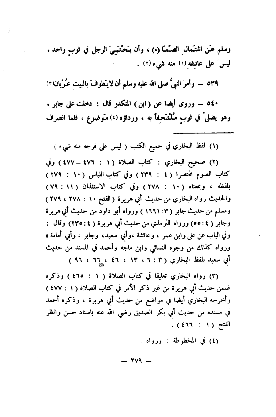 540 - وروى أيضا عن (ابن) المنكدر قال: (دخلت على جابر، وهو يصلِّي في ثوبٍ مُلْتَحِفاً به، ورداؤه 4 موضوع، فلما انصرف