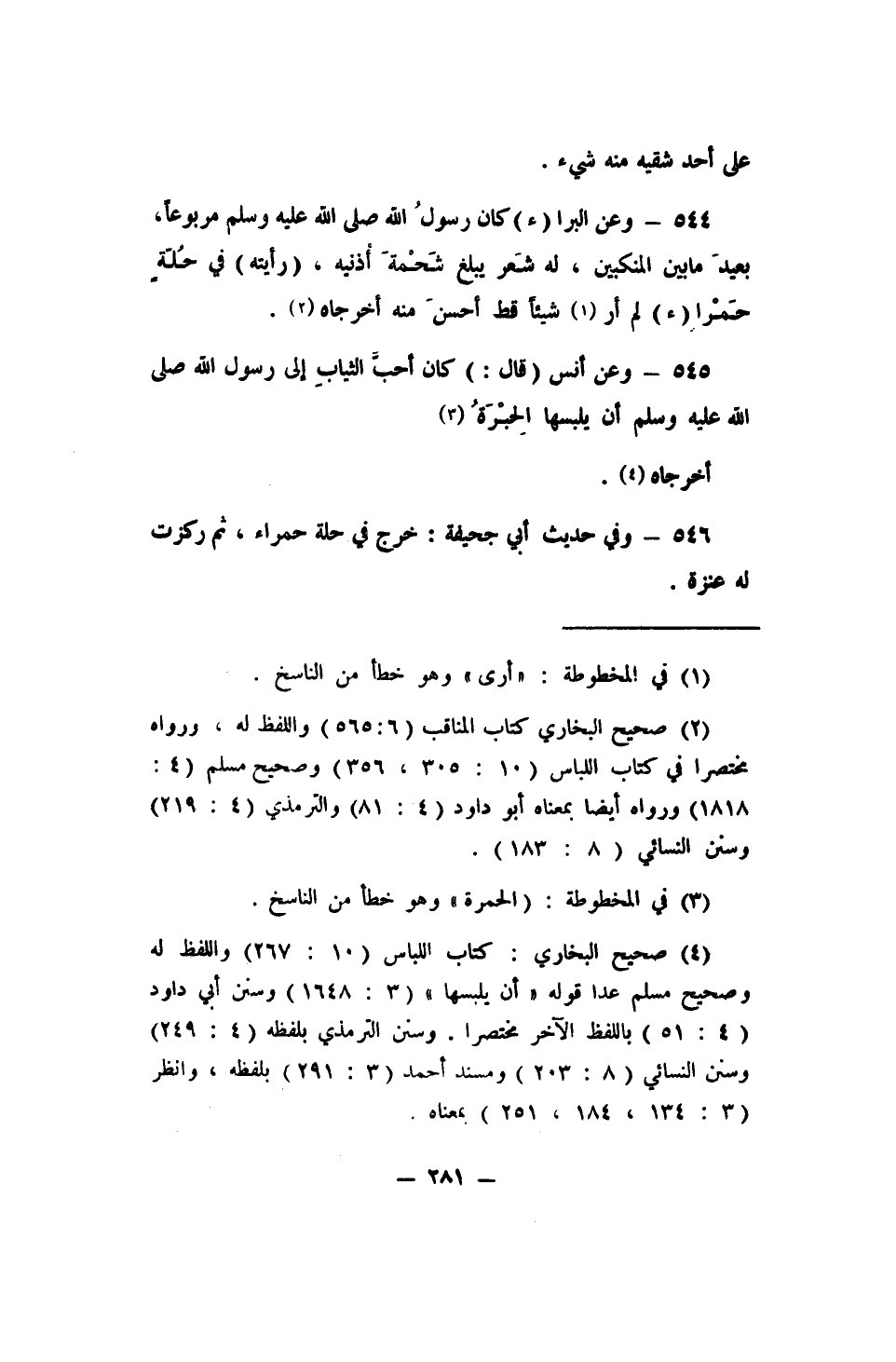 544 - وعن البرا (ء) : (كان رسول الله صلى الله عليه وسلم مربوعاً، بعيدَ ما بين المنكبين، له شَعر يبلغ شَحْمةَ أُذنيه، (رأيته) في حُلَّةٍ حَمْرا (ء) لم أر 1 شيئاً قط أحسنَ منه) .