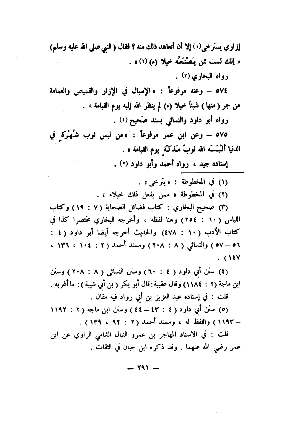 574 - وعنه مرفوعاً: (الإسبال في الإزار والقميص والعمامة، من جر (منها) شيئاً خيلا (ء) لم ينظر الله إليه يوم القيامة (.