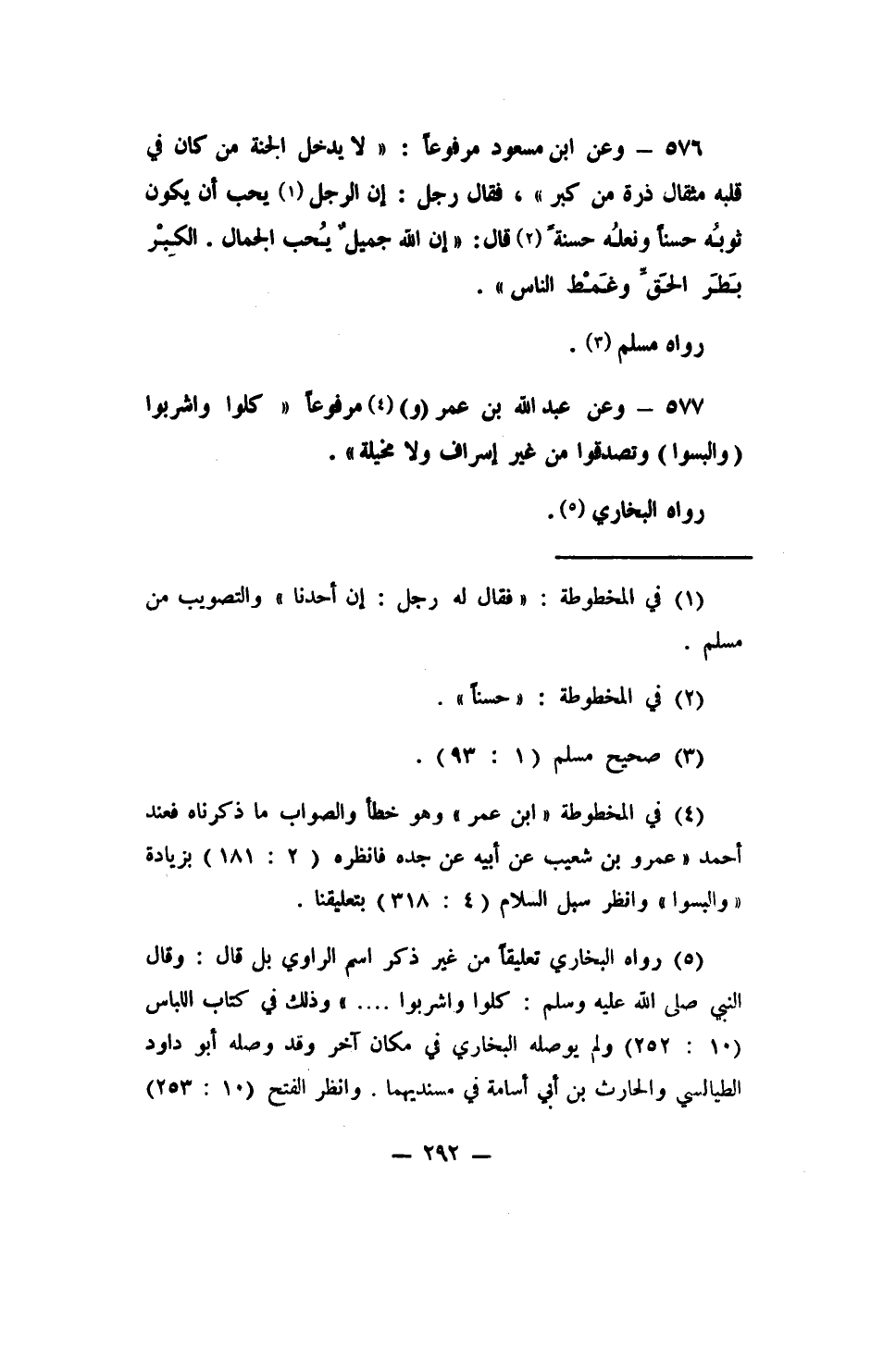 576 - وعن ابن مسعود مرفوعاً: (لا يدخل الجنة من كان في قلبه مثقال ذرة من كبر، فقال رجل: إن الرجل 1 يحب أن يكون ثوبُه حسناً ونعلُه حسنةً 2 قال: إن الله جميلٌ يُحب الجمال. الكِبْرُ بَطَرُ الحَقِّ وغَمْطُ الناس) .