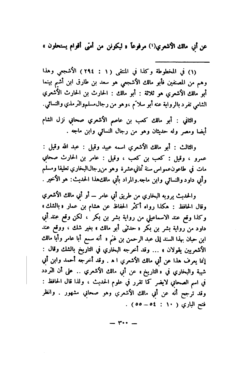 1 في المخطوطة وكذا في المنتقى (1: 294) الأشجعي وهذا وهم من المصنفين فأبو مالك الأشجعي هو سعد بن طارق ابن أشيم بينما أبو مالك الأشعري هو ثلاثة: أبو مالك: الحارث بن الحارث الأشعري الشامي تفرد بالرواية عنه أبو سلاّم, وهو من رجال مسلم والترمذي والنسائي.