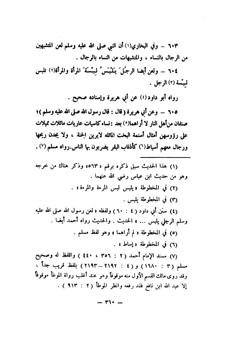 603 - وفي البخاري 1 (أن النبي صلى الله عليه وسلم لعن المتشبهين من الرجال بالنساء، والمتشبهات من النساء بالرجال) .