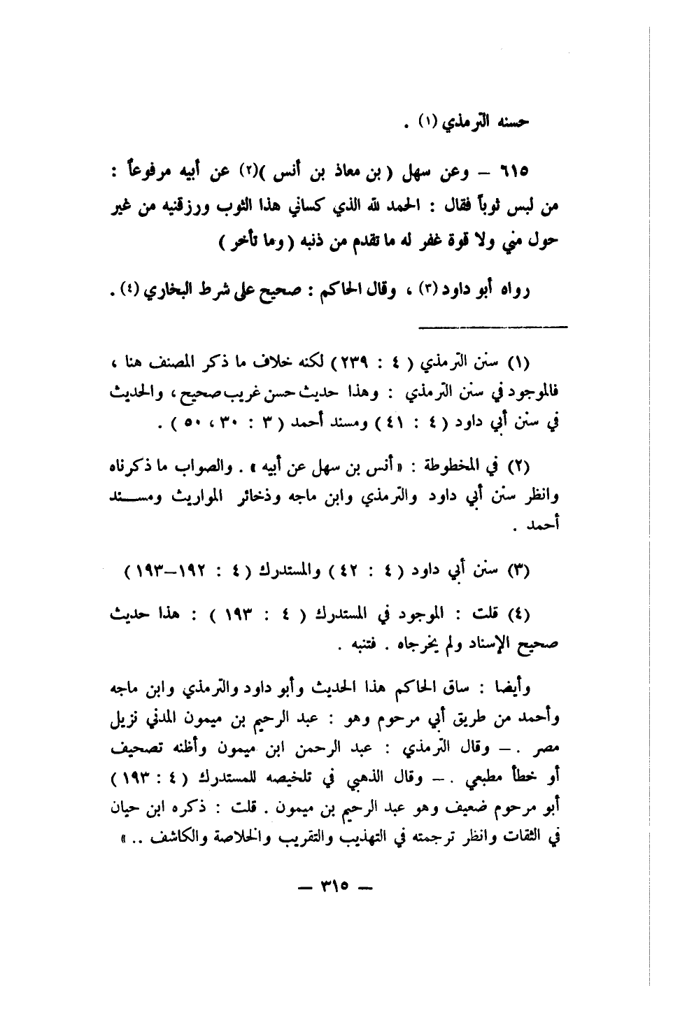 وأيضا: ساق الحاكم هذا الحديث وأبو داود والترمذي وابن ماجه وأحمد من طريق أبي مرحوم وهو: عبد الرحيم بن ميمون المدني نزيل مصر. - وقال الترمذي: عبد الرحمن بن ميمون وأظنه تصحيف أو خطأ مطبعي. - وقال الذهبي في تلخيصه للمستدرك (4: 193) أبو مرحوم ضعيف وهو عبد الرحيم بن ميمون. قلت: ذكره ابن حبان في الثقات. وانظر ترجمته في التهذيب والتقريب والخلاصة والكاشف ...