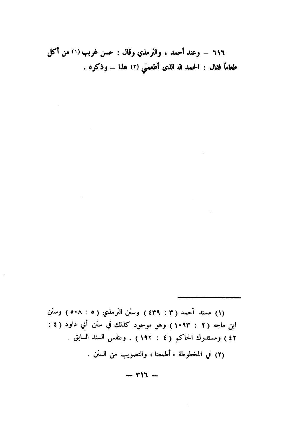 616 - وعند أحمد، والترمذي وقال: حسن غريب 1: من أكل طعاماً فقال: الحمد لله الذي أطعمني 2 هذا - وذكره.