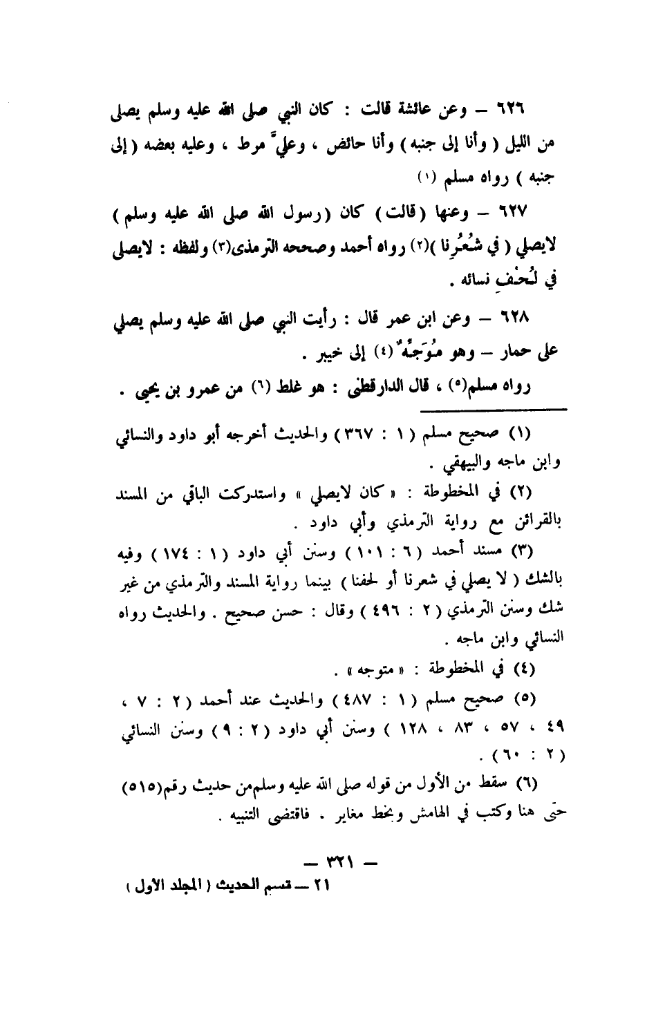 626 - وعن عائشة قالت: (كان النبي صلى الله عليه وسلم يصلي من الليل (وأنا إلى جنبه) وأنا حائض، وعليَّ مرط، وعليه بعضه (إلى جنبه) .