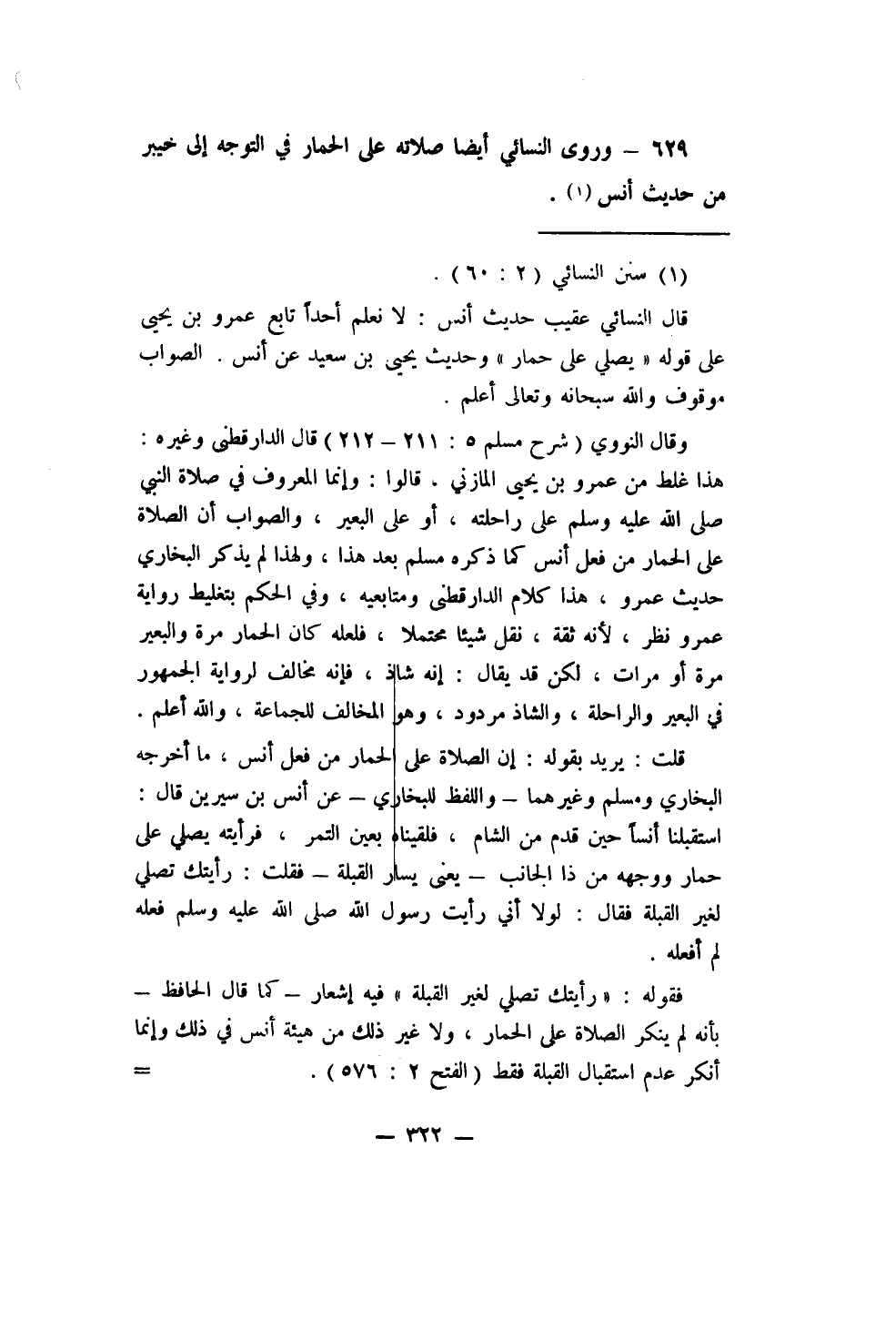 1 سنن النسائي (2: 60) . قال النسائي عقيب حديث أنس: لا نعلم أحدا تابع عمرو بن يحيى على قوله " يصلي على حمار " وحديث يحيى بن سعيد عن أنس. الصواب موقوف، والله سبحانه وتعالى أعلم.