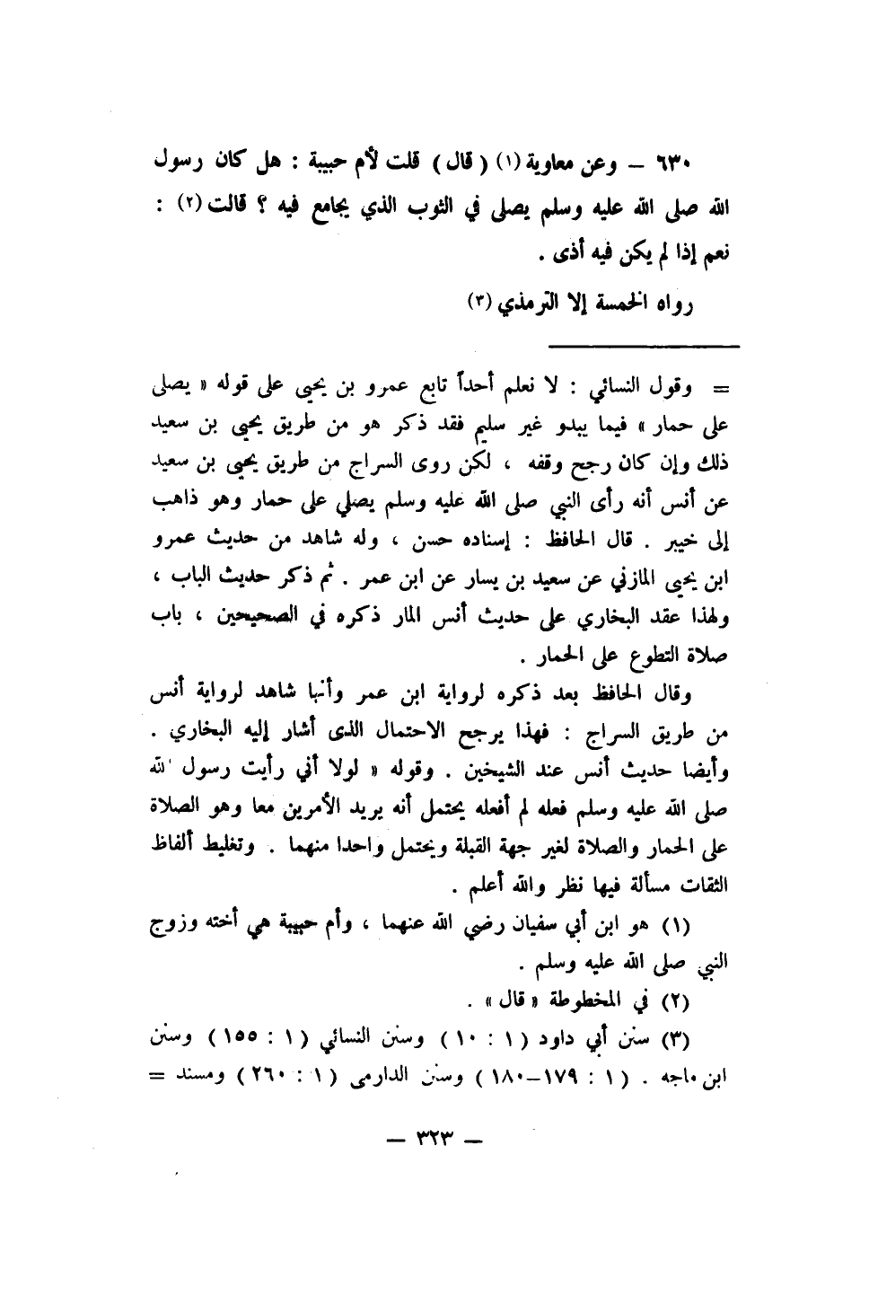 630 - وعن معاوية1 (قال) : قلت لأم حبيبة: (هل كان رسول الله صلى الله عليه وسلم يصلي في الثوب الذي يجامع فيه؟ قالت: 2 نعم إذا لم يكن فيه أذى) .