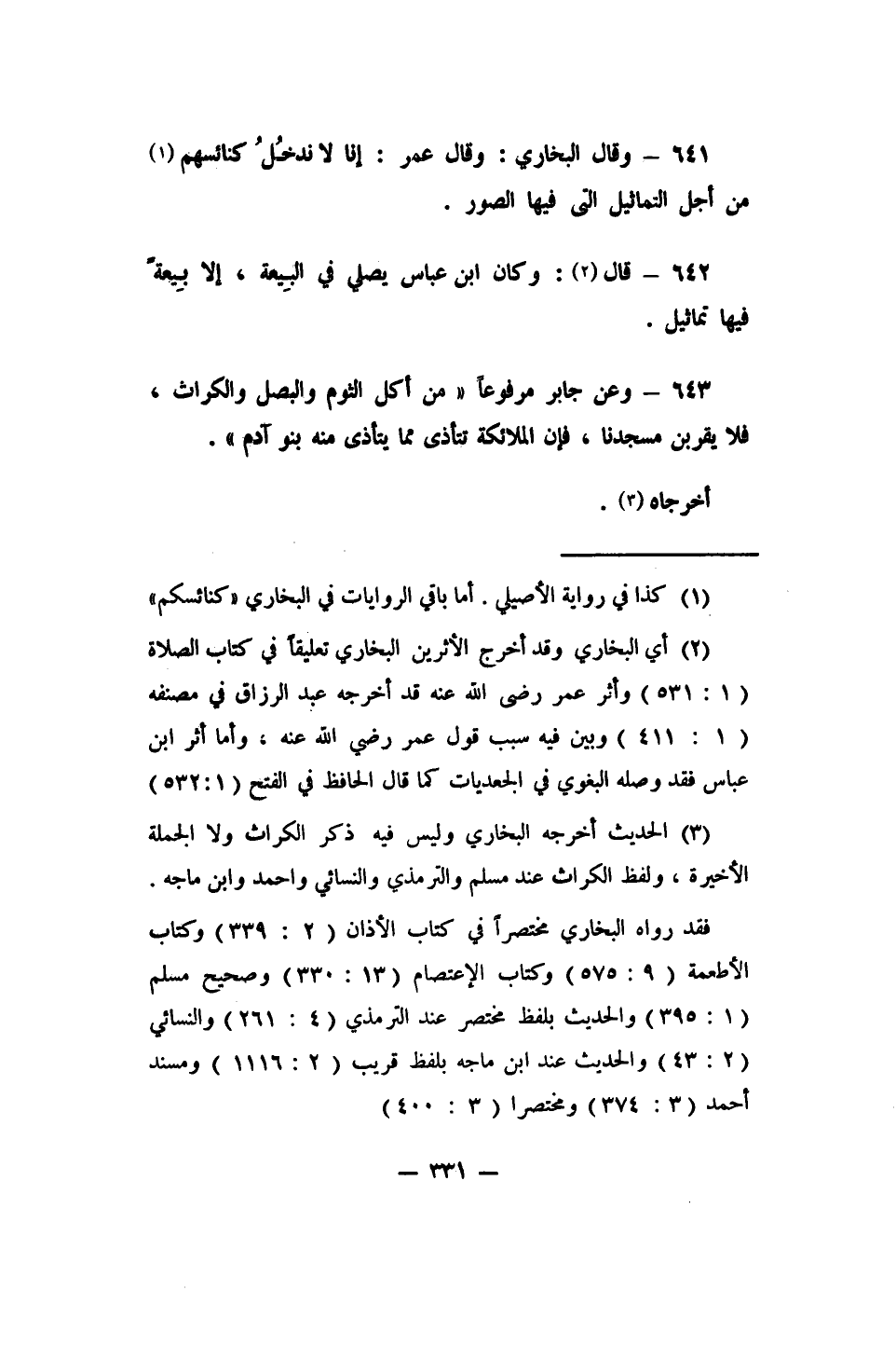641 - وقال البخاري: وقال عمر: (إنا لا نَدْخُلُ كنائسهم 1 من أجل التماثيل التي فيها الصور) .