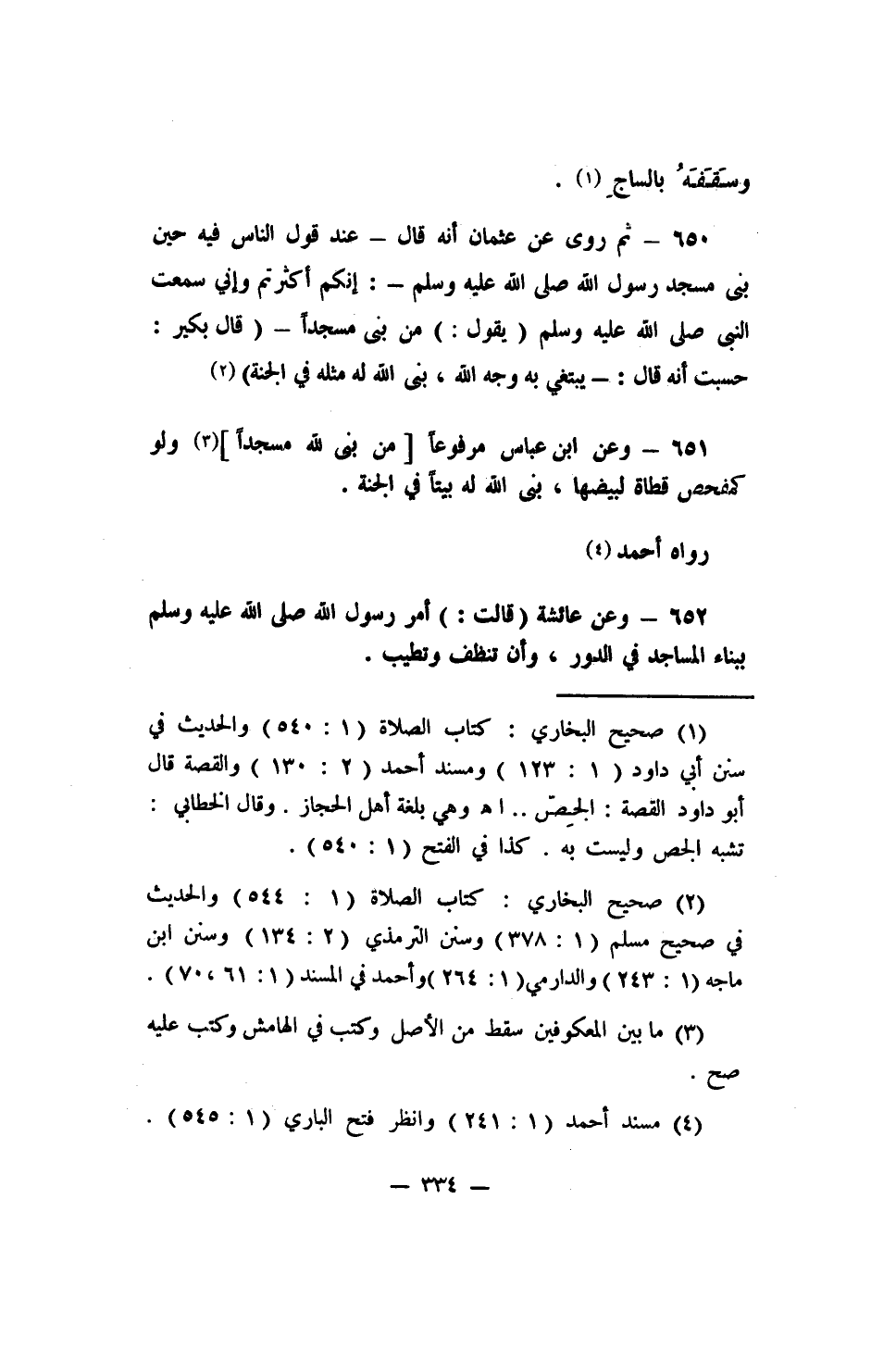 650 - ثم رَوَى عن عثمان أنه قال - عند قول الناس فيه حين بنى مسجد رسول الله صلى الله عليه وسلم -: (إنكم أكثرتم وإني سمعت النبي صلى الله عليه وسلم (يقول) : من بنى مسجداً - (قال بكير: حسبت أنه قال: - يبتغي به وجه الله، بنى الله له مثله في الجنة) 2.
