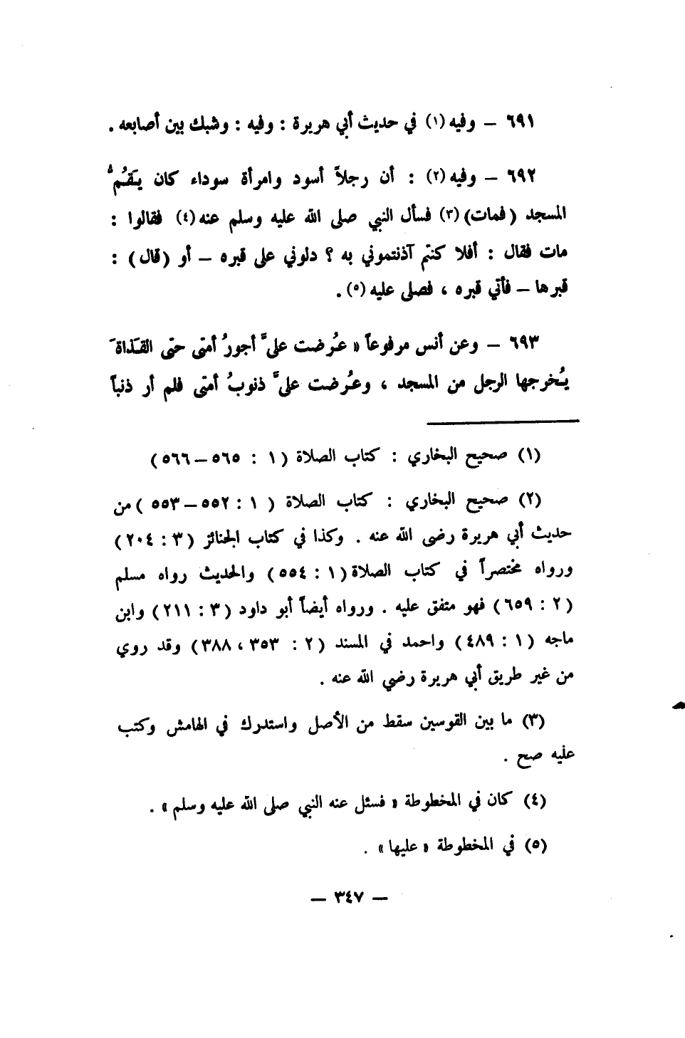 693- وعن أنس مرفوعاً: (عُرِضت عليَّ أجور أمتي حتى القذاةَ يُخرجها الرجل من المسجد، وعُرضت عليَّ ذنوبُ أمتي، فلم أر ذنباً
