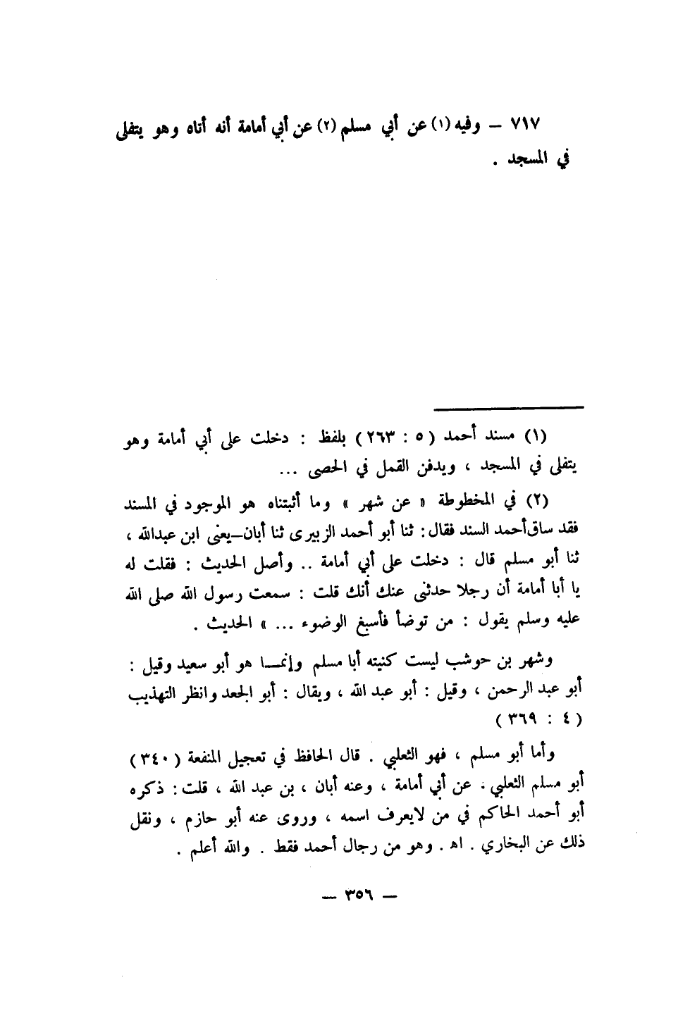 717- وفيه 1 عن أبي مسلم 2 عن أبي أمامة (أنه أتاه وهو يتفلى في المسجد) .