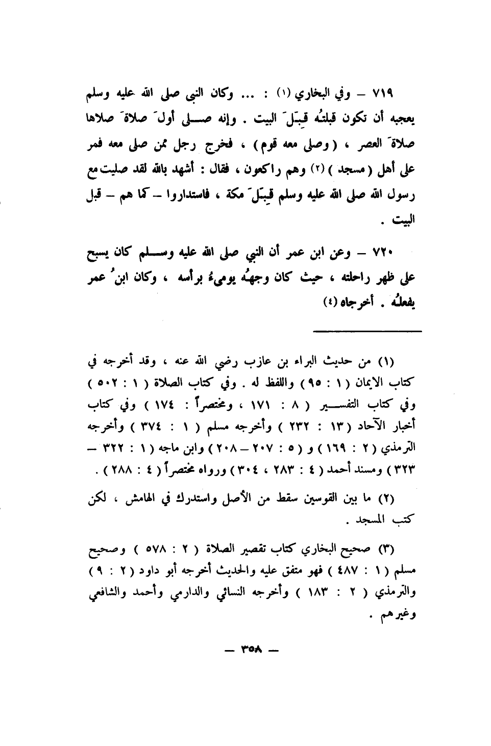 719- وفي البخاري1: ( ... وكان النبي صلى الله عليه وسلم يعجبه أن تكون قبلتُه قِبَلَ البيت. وإنه صلى أولَ صلاةٍ صلاها صلاةَ العصر، (وصلى معه قوم) ، فخرج رجل ممن صلى معه فمر على أهل (مسجد) 2 وهم راكعون، فقال: أشهد بالله لقد صليت مع رسول الله صلى الله عليه وسلم قِبَلَ مكة، فاستداروا - كما هم - قِبَلَ البيت) .