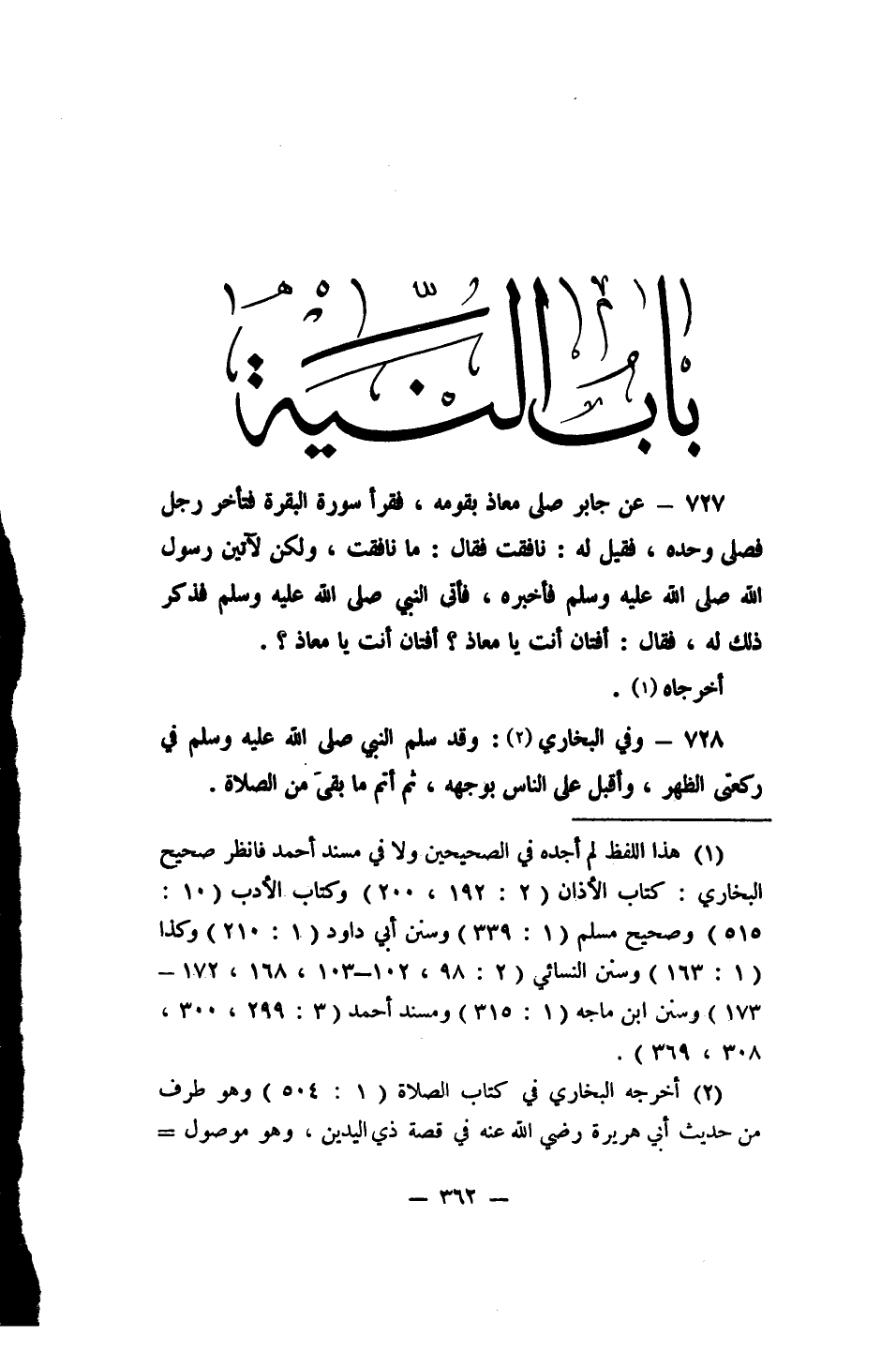 727- عن جابر: (صلى معاذ بقومه، فقرأ سورة البقرة، فتأخر رجل فصلى وحده، فقيل له: نافقت، فقال: ما نافقت، ولكن لآتين رسول الله صلى الله عليه وسلم فأخبره، فأتى النبي صلى الله عليه وسلم فذكر ذلك له، فقال: أفتَّان أنت يا معاذ؟ أفتَّان أنت يا معاذ؟ (أخرجاه 1.
