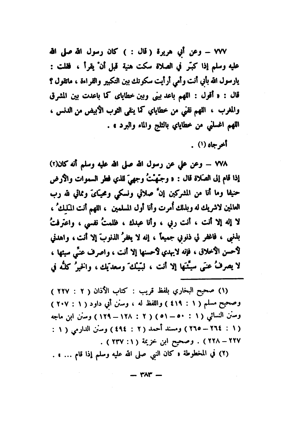 777- وعن أبي هريرة (قال) : (كان رسول الله صلى الله عليه وسلم إذا كبّر في الصلاة سكت هنية قبل أنْ يقرأ، فقلت: يا رسول الله بأبي أنت وأمي أرأيت سكوتك بين التكبير والقراءة، ما تقول؟ قال: أقول: اللهم باعد بيني وبين خطاياي كما باعدت بين المشرق والمغرب، اللهم نقني من خطاياي كما ينقى الثوب الأبيض من الدنس، اللهم اغسلني من خطاياي بالثلج والماء والبرد) أخرجاه. 1.