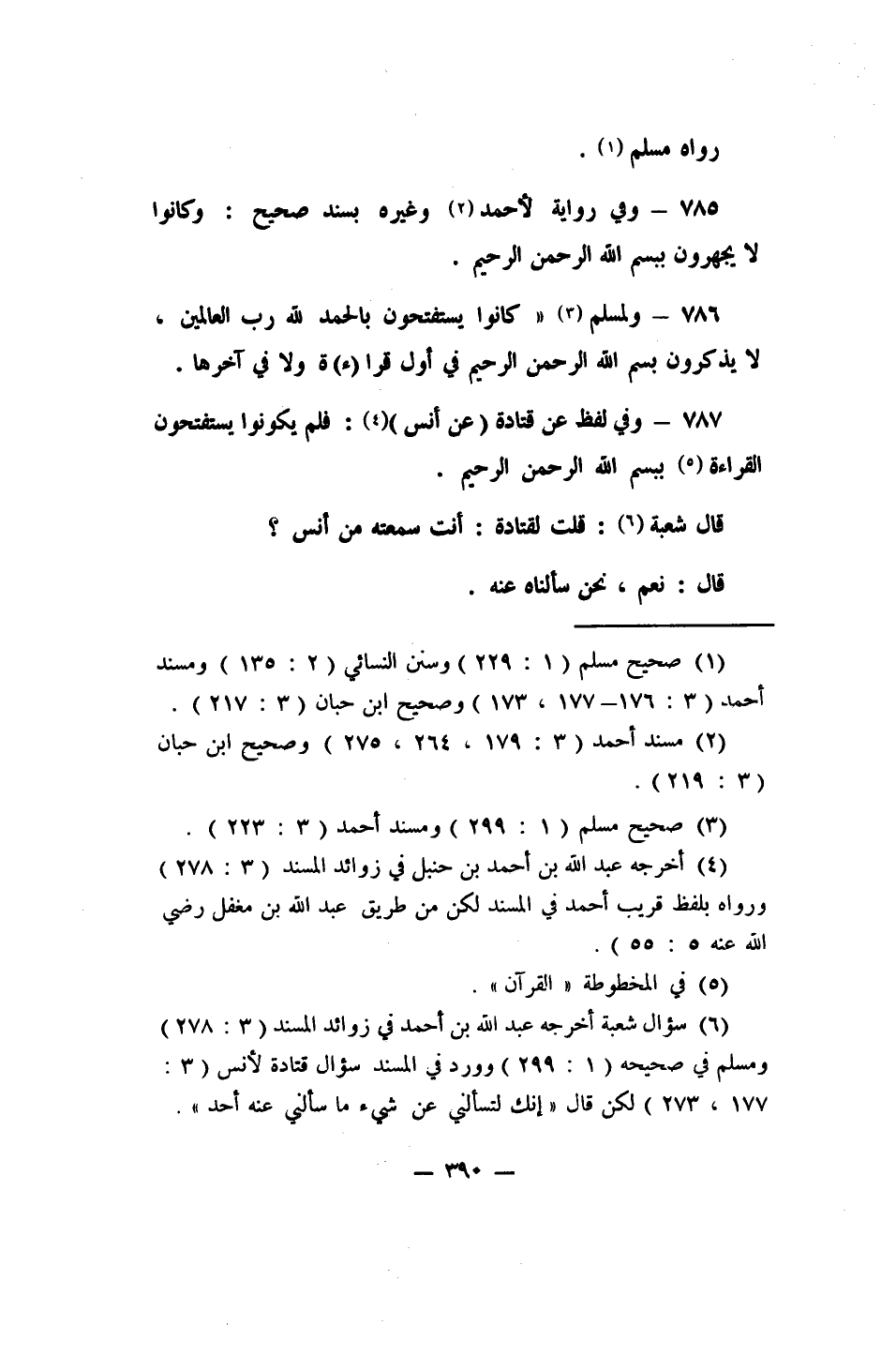 786- ولمسلم 3: (كانوا يستفتحون بالحمد لله رب العالمين، لا يذكرون بسم الله الرحمن الرحيم في أول قرا (ء) ة ولا في آخرها) .