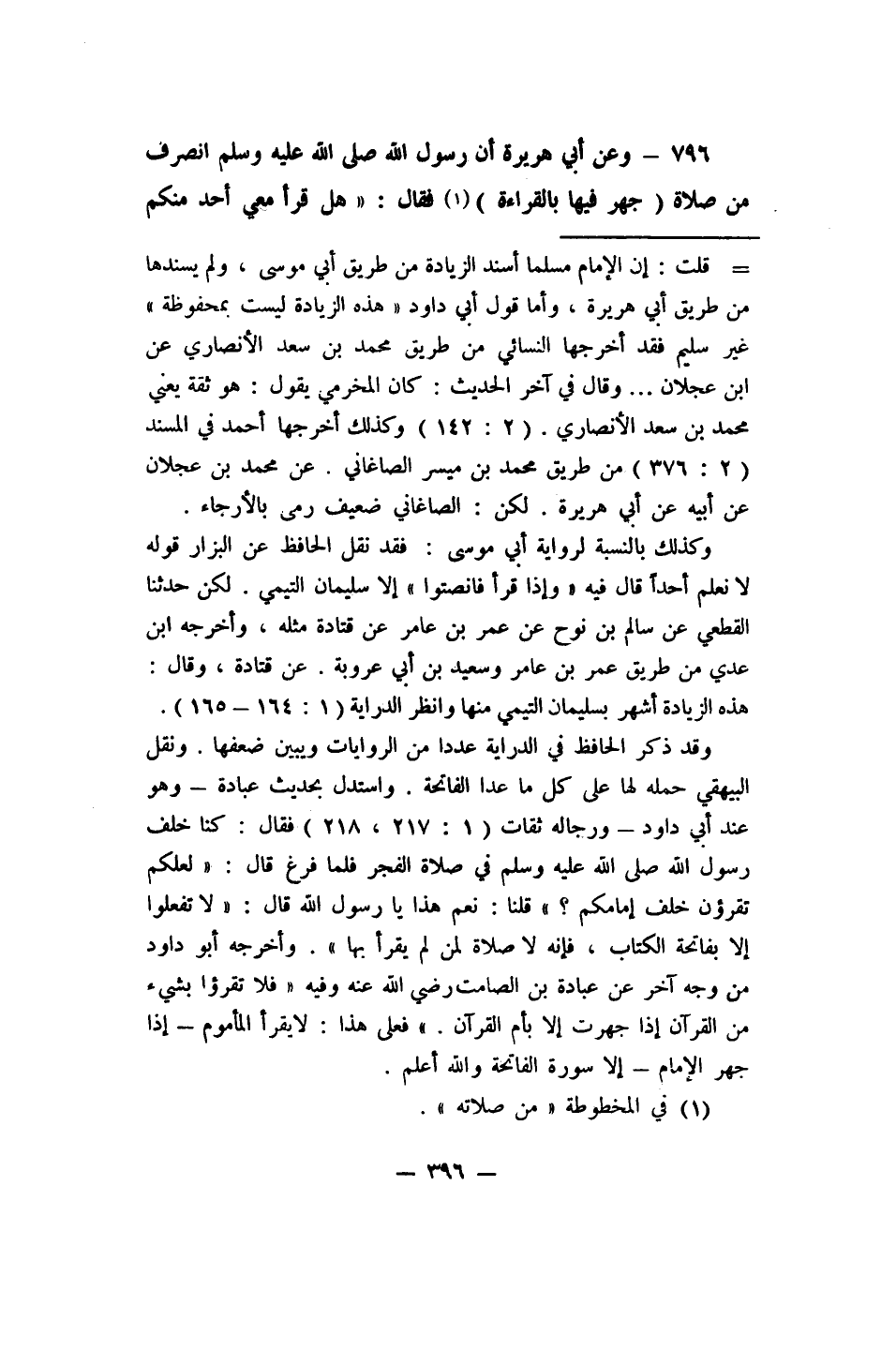 796- وعن أبي هريرة أن رسول الله صلى الله عليه وسلم (انصرف من صلاة (جهر فيها بالقراءة) 1 فقال: " هل قرأ معي أحد منكم