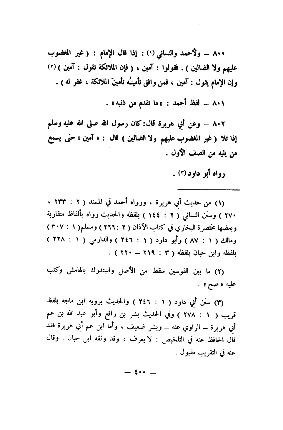 802- وعن أبي هريرة قال: (كان رسول الله صلى الله عليه وسلم إذا تلا {غير المغضوب عليهم ولا الضالين} قال: " آمين " حتى يسمع من يليه من الصف الأول) .