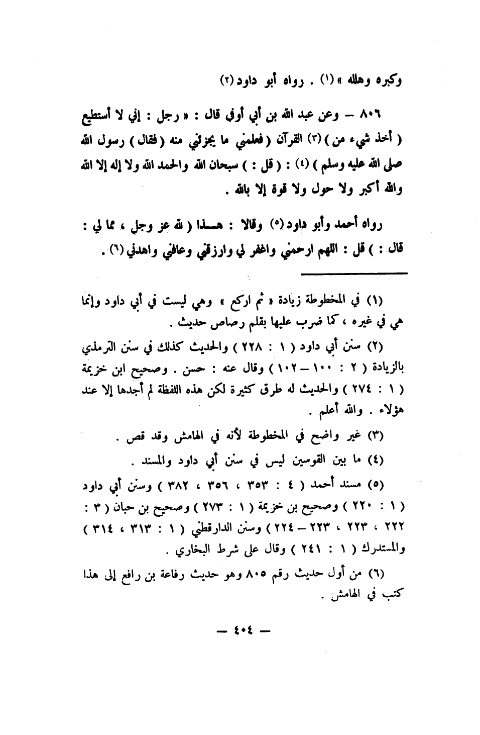 806- وعن عبد الله بن أبي أوفى قال رجل: (إني لا أستطيع (أخذ شيء من) 3 القرآن، (فعلمني ما يجزئني منه، (فقال) رسول الله صلى الله عليه وسلم) 4: قل سبحان الله والحمد لله ولا إله إلا الله والله أكبر ولا حول ولا قوة إلا بالله)