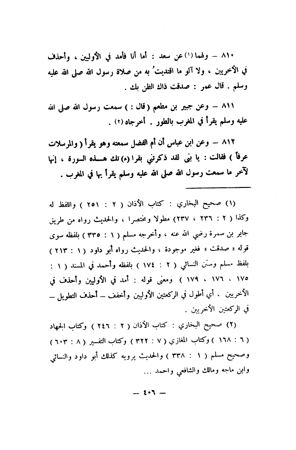 812- وعن ابن عباس: (أن أم الفضل سمعته وهو يقرأ {وَالْمُرْسَلاتِ عُرْفاً} 3 فقالت: يا بني لقد ذكرتني بقرا (ء) تك هذه السورة، إنها لآخر ما سمعت رسول الله صلى الله عليه وسلم يقرأ بها في المغرب) .