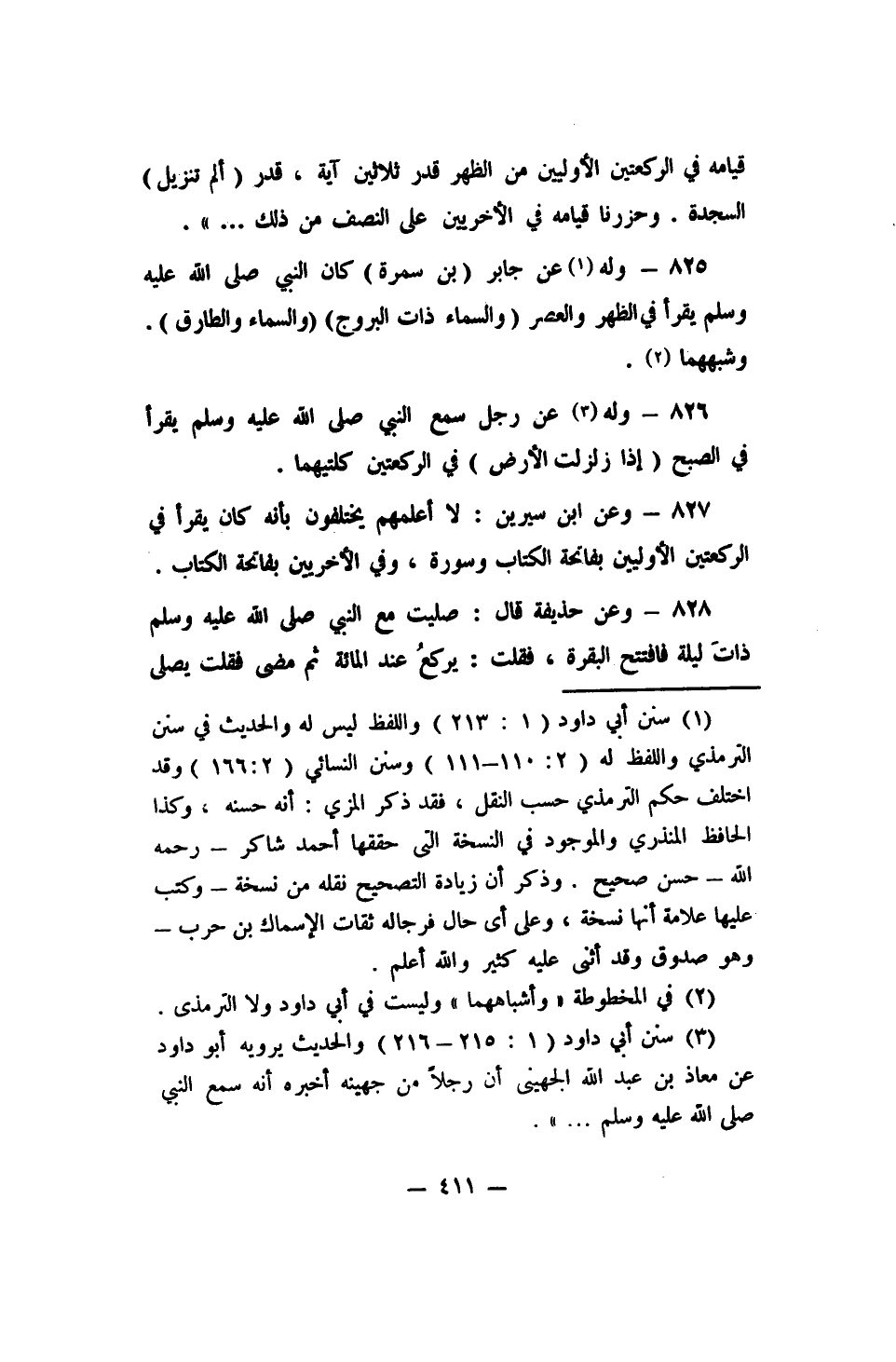 825 - وله 1 عن جابر (بن سمرة) : (كان النبي صلى الله عليه وسلم يقرأ في الظهر والعصر (والسماء ذات البروج) (والسماء والطارق) ، وشبههما) 2.