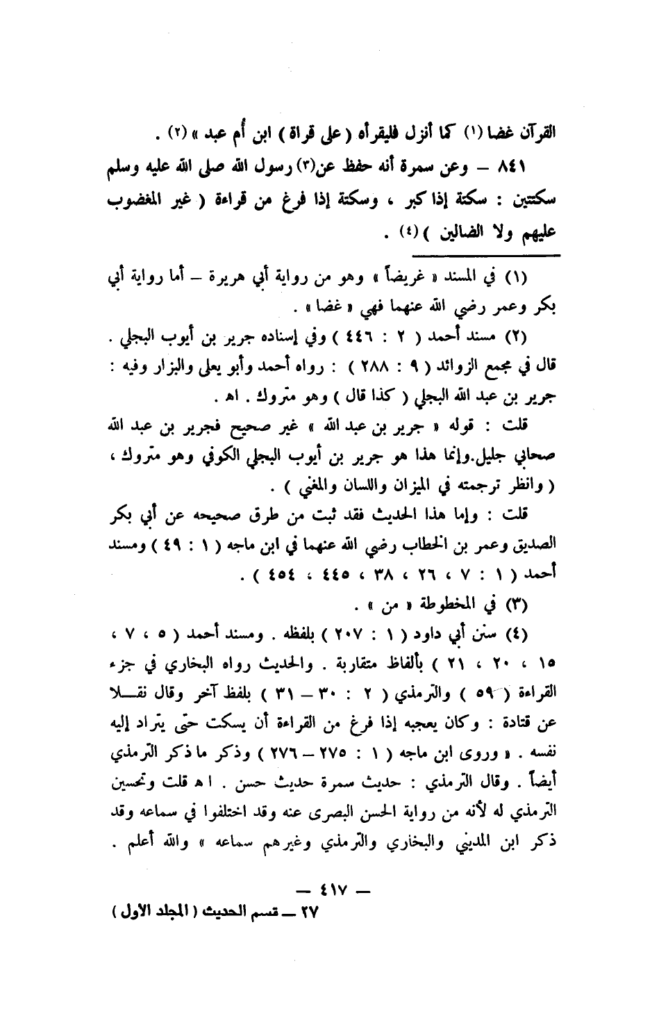 841 - وعن سمرة: (أنه حفظ عن3 رسول الله صلى الله عليه وسلم سكتتين: سكتة إذا كبر، وسكتة إذا فرغ من قراءة {غَيْرِ الْمَغْضُوبِ عَلَيْهِمْ وَلا الضَّالِّينَ} (4.