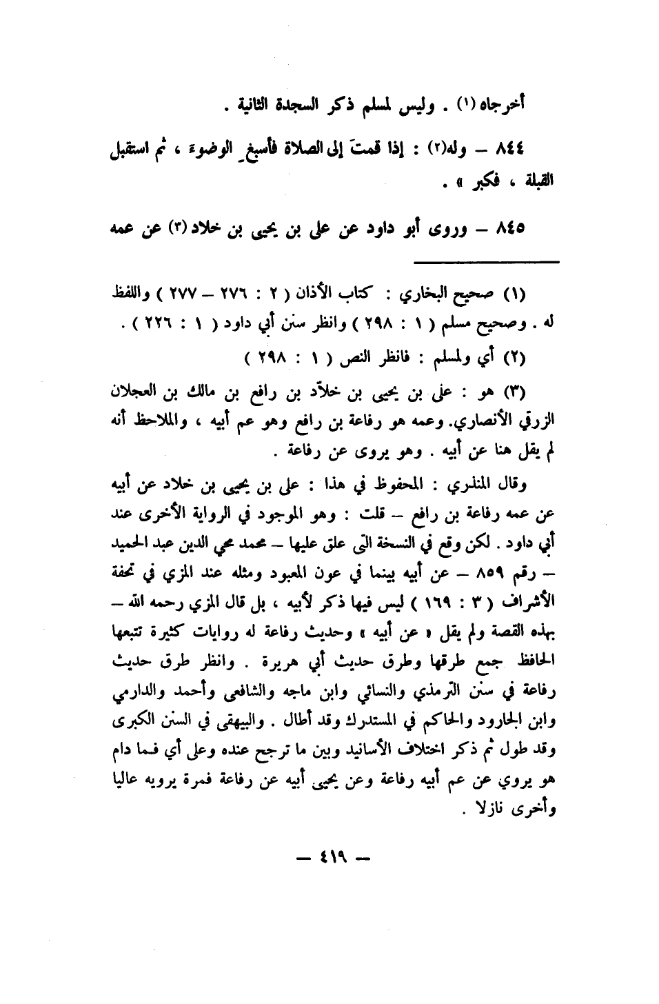 3 هو: علي بن يحيى بن خلاد بن رافع بن مالك بن العجلان الزرقي الأنصاري. وعمه هو رفاعة بن رافع وهو عم أبيه, والملاحظ أنه لم يقل هنا عن أبيه. وهو يروي عن رفاعة. وقال المنذري: المحفوظ في هذا: علي بن يحيى بن خلاد عن أبيه عن عمه رفاعة بن رافع. قلت: وهو الموجود في الرواية الأخرى عند أبي داود. لكن وقع في النسخة التي علق عليها -محمد محيي الدين عبد الحميد -رقم 859- عن أبيه، بينما في عون المعبود ومثله عند المزي في تحفة الأشراف (3: 169) ليس فيها ذكر لأبيه, بل قال المزي - رحمه الله- بهذه القصة ولم يقل "عن أبيه"، وحديث رفاعة له روايات كثيرة تتبعها الحافظ، جمع طرقها وطرق حديث أبي هريرة. وانظر طرق حديث رفاعة في سنن الترمذي والنسائي وابن ماجه والشافعي وأحمد والدارمي وابن الجارود والحاكم في المستدرك وقد أطال، والبيهقي في السنن الكبرى وقد طول، ثم ذكر اختلاف الأسانيد وبين ما ترجح عنده، وعلى أي فما دام هو يروي عن عم أبيه رفاعة وعن يحيى أبيه عن رفاعة فمرة يرويه عاليا وأخرى نازلا.