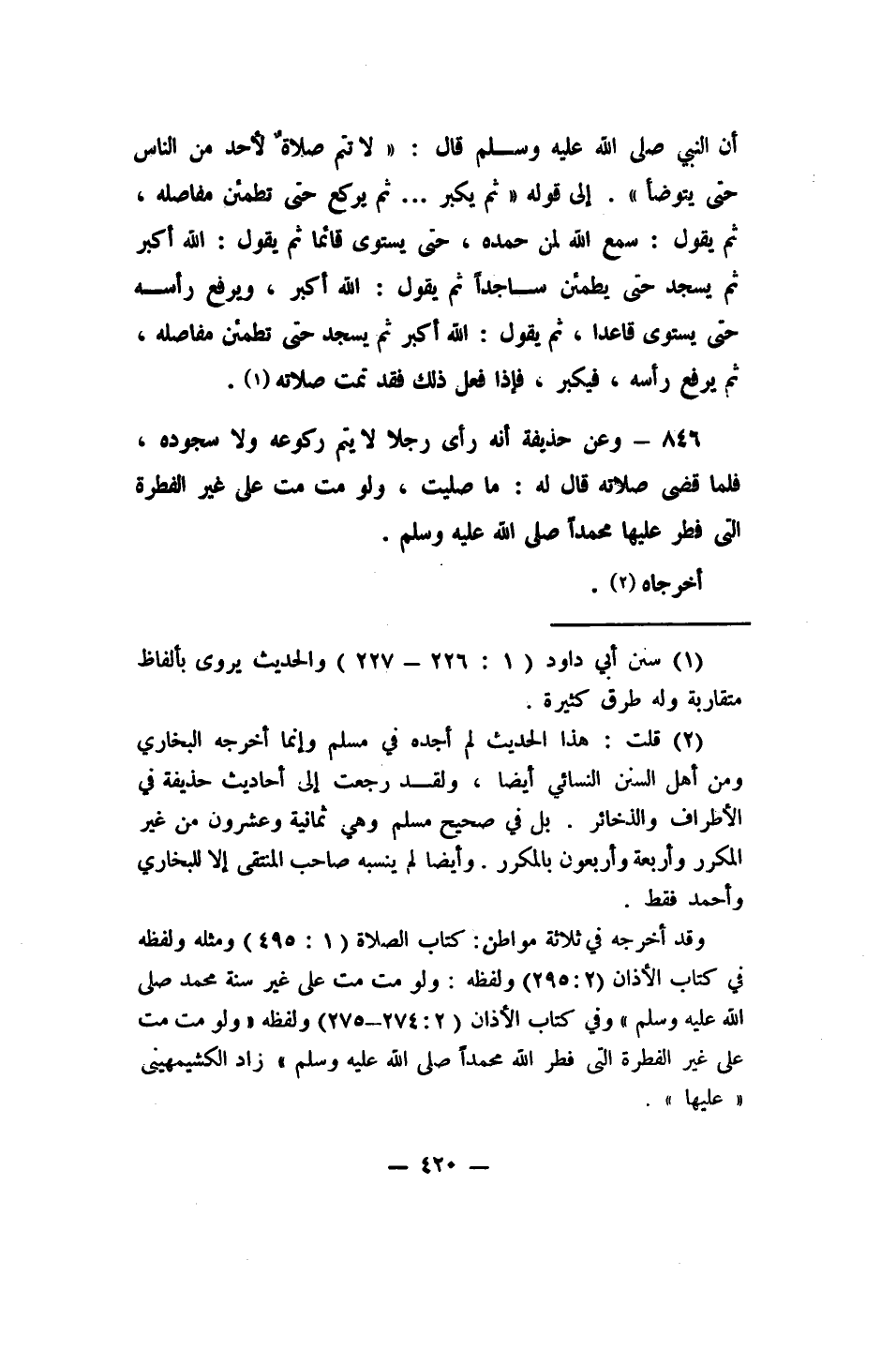 846- وعن حذيفة أنه رأى رجلا لا يتم ركوعه ولا سجوده، فلما قضى صلاته قال له: (ما صليت، ولو مت مت على غير الفطرة التي فطر عليها محمداً صلى الله عليه وسلم) .