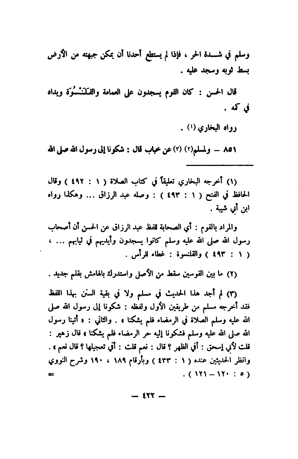 عبد الرزاق ... وهكذا رواه ابن أبي شيبة. والمراد بالقوم: أي الصحابة للفظ عبد الرزاق عن الحسن أن أصحاب رسول الله صلى الله عليه وسلم كانوا يسجدون وأيديهم في ثيابهم ... (1: 493) والقلنسوة: غطاء للرأس.