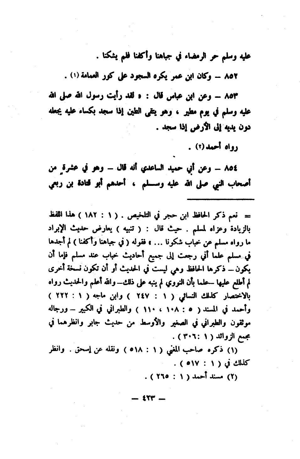 853- وعن ابن عباس قال: (لقد رأيت رسول الله صلى الله عليه وسلم في يوم مطير، وهو يتقي الطين، إذا سجد بكساء عليه يجعله دون يديه إلى الأرض إذا سجد) . رواه أحمد 2.