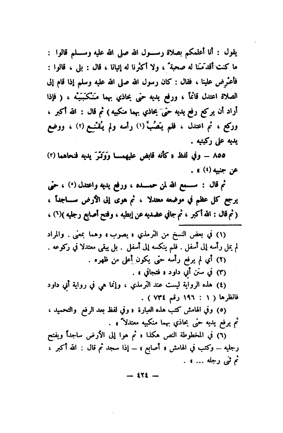 يقول: (أنا أعلمكم بصلاة رسول الله صلى الله عليه وسلم. قالوا: ما كنت أقدَمَنا له صحبةً، ولا أكثرنا له إتيانا، قال: بلى، قالوا: فاعرضْ علينا، فقال: كان رسول الله صلى الله عليه وسلم إذا قام إلى الصلاة اعتدل قائماً، ورفع يديه حتى يحاذي بهما مَنْكَبَيْه، (فإذا أراد أن يركع رفع يديه حتى يحاذي بهما منكبيه) ، ثم قال: الله أكبر، وركع، ثم اعتدل، فلم يَصُبَّ 1 رأسه ولم يقْنِعْ2، ووضع يديه على ركبتيه) .