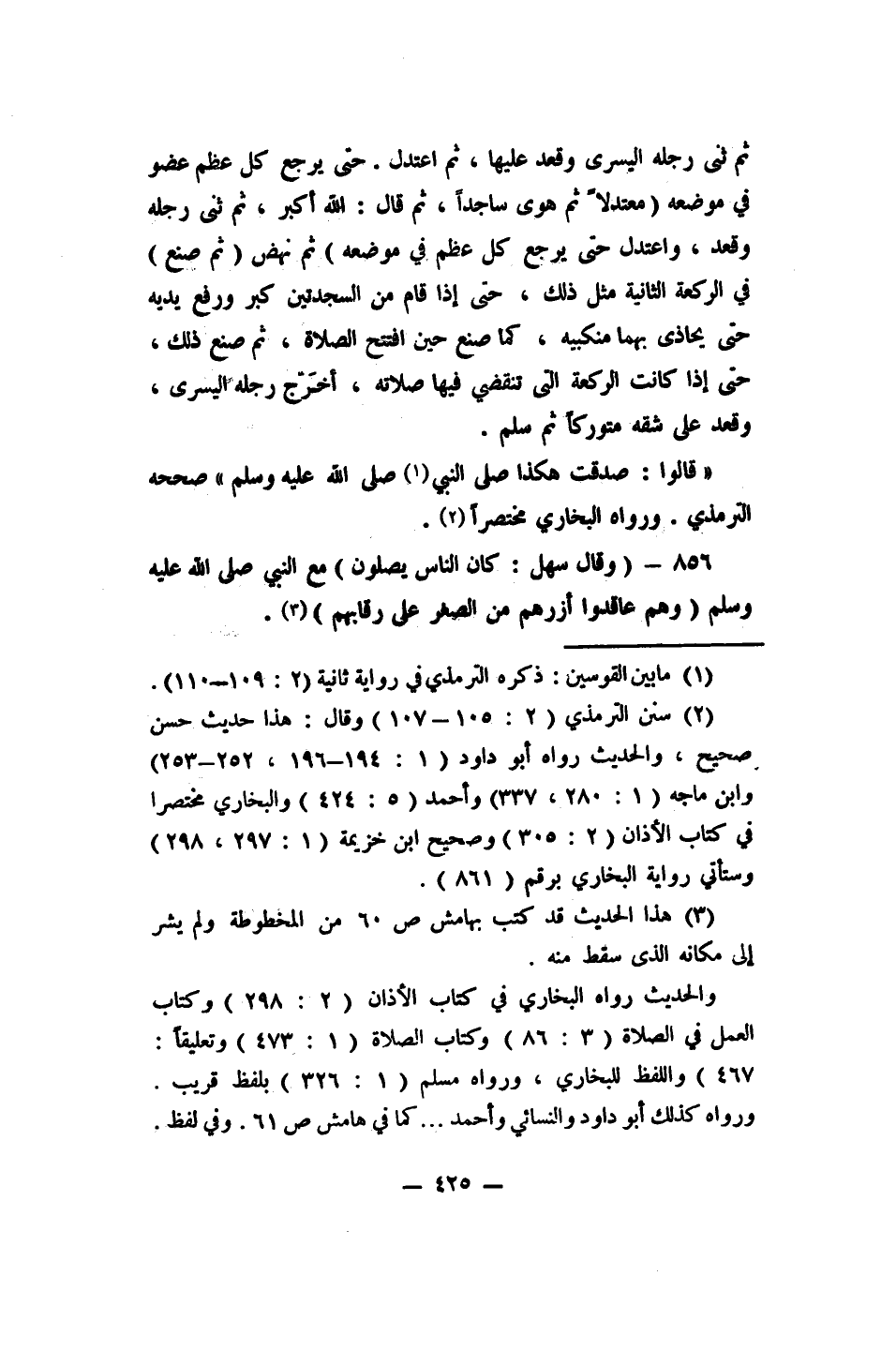 ثم ثنى رجله اليسرى وقعد عليها، ثم اعتدل. حتى يرجع كل عظم عضو في موضعه (معتدلاً ثم هوى ساجداً، ثم قال: الله أكبر، ثم ثنى رجله وقعد، واعتدل حتى يرجع كل عظم في موضعه) ، ثم نهض، (ثم صنع) في الركعة الثانية مثل ذلك، حتى إذا قام من السجدتين كبر ورفع يديه حتى يحاذى بهما منكبيه، كما صنع حين افتتح الصلاة، ثم صنع ذلك، حتى إذا كانت الركعة التي تنقضي فيها صلاته، أخَرّج رجله اليسرى، وقعد على شقه متوركاً ثم سلم. قالوا: صدقت هكذا صلى النبي 1 صلى الله عليه وسلم (صححه الترمذي. ورواه البخاري مختصرا. 2.