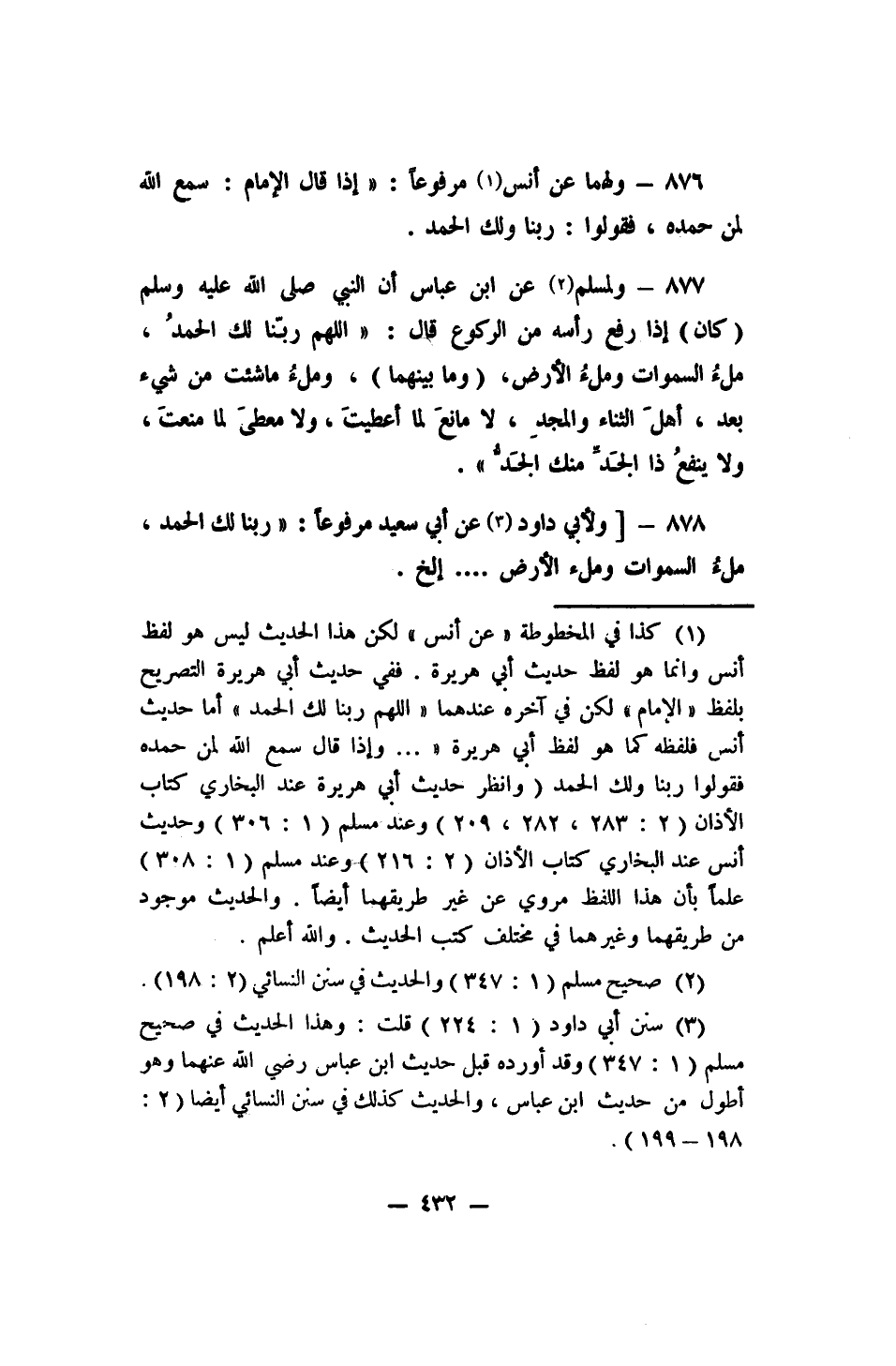 877- ولمسلم 2 عن ابن عباس: (أن النبي صلى الله عليه وسلم (كان) إذا رفع رأسه من الركوع قال: اللهم ربّنا لك الحمدُ، ملءُ السموات وملءُ الأرض، (وما بينهما) ، وملءُ ما شئت من شيء بعد، أهلَ الثناء والمجدِ، لا مانعَ لما أعطيتَ، ولا معطى لما منعت، ولا ينفع ذا الجد منك الجَدُّ) .
