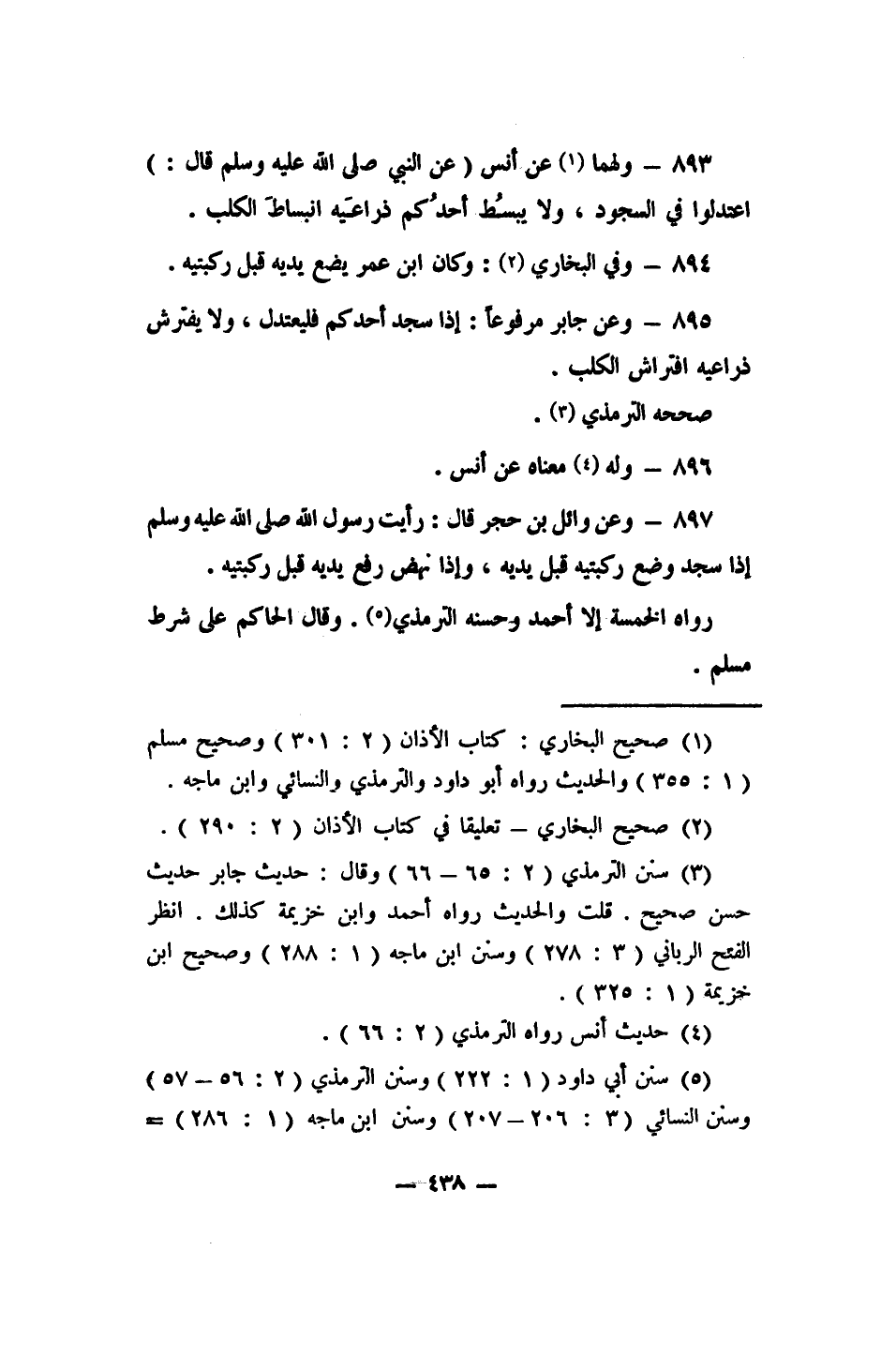 897- وعن وائل بن حجر قال: (رأيت رسول الله صلى الله عليه وسلم إذا سجد وضع ركبتيه قبل يديه، وإذا نهض رفع يديه قبل ركبتيه) .
