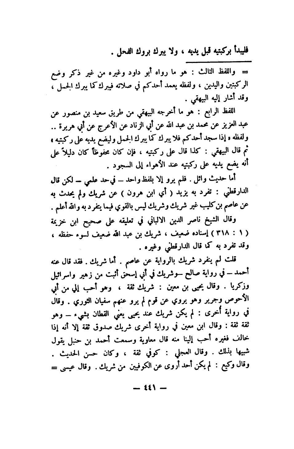 = واللفظ الثالث: هو ما رواه أبو داود وغيره من غير ذكر وضع الركبتين واليدين, ولفظه "يعمد أحدكم في صلاته فيبرك كما يبرك الجمل"، وقد أشار إليه البيهقي. اللفظ الرابع: هو ما أخرجه البيهقي من طريق سعيد بن منصور عن عبد العزيز عن محمد بن عبد الله عن أبي الزناد عن الأعرج عن أبي هريرة.. ولفظه "إذا سجد أحدكم فلا يبرك كما يبرك الجمل وليضع يديه على ركبتيه". ثم قال البيهقي: كذا قال على ركبتيه, فإن كان محفوظا كان دليلا على أنه يضع يديه على ركبتيه عند الإهواء إلى السجود. أما حديث وائل، فلم يرو إلا بلفظ واحد -في حد علمي- لكن قال الدارقطني: تفرد به يزيد (أي ابن هارون) عن شريك، ولم يحدث به عن عاصم بن كليب غير شريك، وشريك ليس بالقوي فيما يتفرد به، والله أعلم. وقال الشيخ ناصر الدين الألباني في تعليقه على صحيح ابن خزيمة (1: 318) : إسناده ضعيف, شريك بن عبد الله ضعيف لسوء حفظه, وقد تفرد به كما قال الدارقطني وغيره. قلت لم ينفرد شريك بالرواية عن عاصم. أما شريك، فقد قال عنه أحمد -في رواية صالح-: وشريك في أبي إسحاق أثبت من زهير وإسرائيل وزكريا. وقال يحيى بن معين: شريك ثقة, وهو أحب إلي من أبي الأحوص وجرير، وهو يروي عن قوم لم يرو عنهم سفيان الثوري. وقال في رواية أخرى: لم يكن شريك عند يحيى يعني القطان بشيء، وهو ثقة ثقة. وقال ابن معين في رواية أخرى: شريك صدوق ثقة، إلا أنه إذا خالف فغيره أحب إلينا منه قال معاوية وسمعت أحمد بن حنبل يقول شبيها بذلك. وقال العجلي: كوفي ثقة, وكان حسن الحديث. وقال وكيع: لم يكن أحد أروى عن الكوفيين من شريك. وقال عيسى =