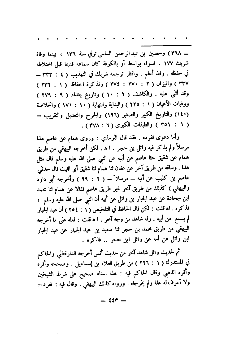 = 368) . وحصين بن عبد الرحمن السلمي توفي سنة 136 , بينما وفاة شريك 177 , فسواء بواسط أو بالكوفة كان سماعه قديما قبل اختلاطه في حفظه. والله أعلم. وانظر ترجمة شريك في التهذيب (4: 333- 337) والميزان (2: 270، 274) وتذكرة الحفاظ (1: 232) وقد أثنى عليه، والكاشف (2: 10) وتاريخ بغداد (9: 279) ووفيات الأعيان (1: 225) والبداية والنهاية (10: 171) والخلاصة (140) والتاريخ الكبير والصغير (196) والجرح والتعديل، والتقريب (1: 351) والطبقات الكبرى (6: 378) . وأما دعوى تفرده، فقد قال الترمذي: وروى همام عن عاصم هذا مرسلا، ولم يذكر فيه وائل بن حجر. اهـ. لكن أخرجه البيهقي من طريق همام عن شقيق ثنا عاصم عن أبيه عن النبي صلى الله عليه وسلم قال مثل هذا. وساقه من طريق آخر من عفان ثنا همام ثنا شقيق أبو الليث قال حدثني عاصم بن كليب عن أبيه -مرسلا- (2: 99) ، وأخرجه أبو داود والبيهقي كذلك من طريق آخر غير طريق عاصم، فقالا عن همام ثنا محمد ابن جحادة عن عبد الجبار بن وائل عن أبيه أن النبي صلى الله عليه وسلم, فذكره. اهـ. قلت: لكن قال الحافظ في التلخيص (1: 254) أن عبد الجبار لم يسمع من أبيه. وله شاهد من وجه آخر. اهـ. قلت: لعله عنى ما أخرجه البيهقي من طريق محمد بن حجر ثنا سعيد بن عبد الجبار عن عبد الجبار بن وائل عن أمه عن وائل بن حجر.. فذكره. ثم لحديث وائل شاهد آخر من حديث أنس أخرجه الدارقطني والحاكم في المستدرك (1: 226) من طريق العلاء بن إسماعيل. وصححه وأقره، وأقره الذهبي، وقال الحاكم فيه: هذا إسناد صحيح على شرط الشيخين ولا أعرف له علة ولم يخرجاه. ورواه كذلك البيهقي، وقال فيه: تفرد =