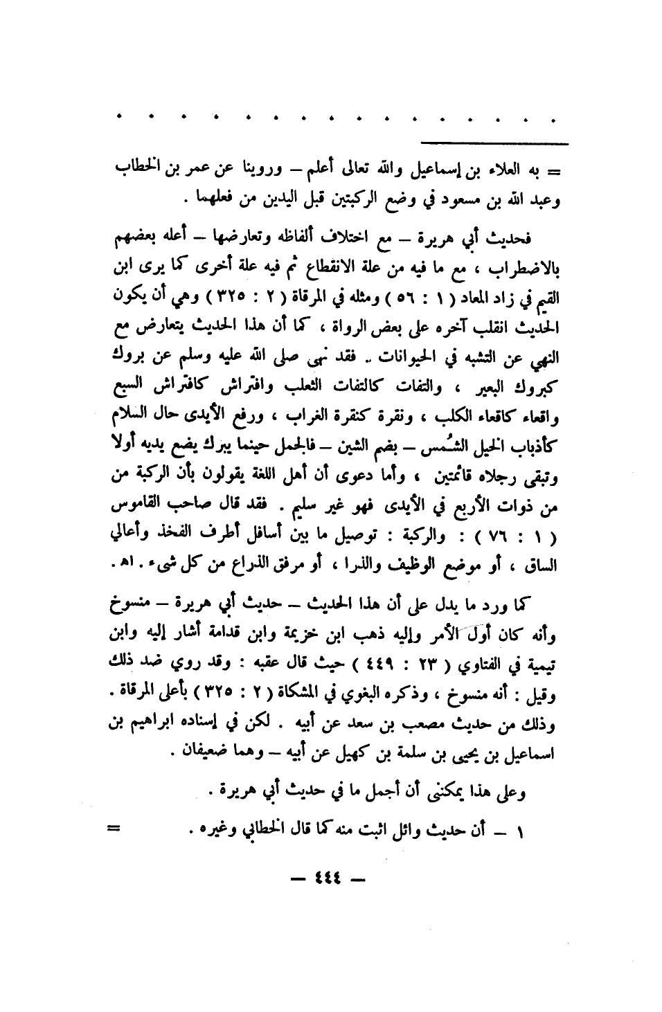 به العلاء بن -إسماعيل والله تعالى أعلم- وروينا عن عمر بن الخطاب وعبد الله بن مسعود في وضع الركبتين قبل اليدين فعلهما. فحديث أبي هريرة -مع اختلاف ألفاظه وتعارضها- أعله بعضهم بالاضطراب, مع ما فيه من علة الانقطاع، ثم فيه علة أخرى كما يرى ابن القيم في زاد المعاد (1: 56) ومثله في المرقاة (2: 325) وهي أن يكون الحديث انقلب آخره على بعض الرواة, كما أن هذا الحديث يتعارض مع النهي عن التشبه في الحيوانات. فقد نهى صلى الله عليه وسلم عن بروك كبروك البعير, والتفات كالتفات الثعلب، وافتراش كافتراش السبع، وإقعاء كإقعاء الكلب, ونقرة كنقرة الغراب, ورفع الأيدي حال السلام كأذناب الخيل الشمس -بضم الشين-. فالجمل حينما يبرك يضع يديه أولا، وتبقى رجلاه قائمتين, وأما دعوى أن أهل اللغة يقولون بأن الركبة من ذوات الأربع في الأيدي فهو غير سليم. فقد قال صاحب القاموس (1: 76) : والركبة: توصيل ما بين أسافل أطرف الفخذ وأعالي الساق, أو موضع الوظيف والذرا, أو مرفق الذراع من كل شىء. اهـ. كما ورد ما يدل على أن هذا الحديث -حديث أبي هريرة- منسوخ وأنه كان أول الأمر، وإليه ذهب ابن خزيمة وابن قدامة أشار إليه وابن تيمية في الفتاوي (23: 449) حيث قال عقبه: وقد روي ضد ذلك وقيل: أنه منسوخ, وذكره البغوي في المشكاة (2: 325) بأعلى المرقاة، وذلك من حديث مصعب بن سعد عن أبيه، لكن في إسناده إبراهيم بن إسماعيل بن يحيى بن سلمة بن كهيل عن أبيه، وهما ضعيفان. وعلى هذا يمكنني أن أجمل ما في حديث أبي هريرة.