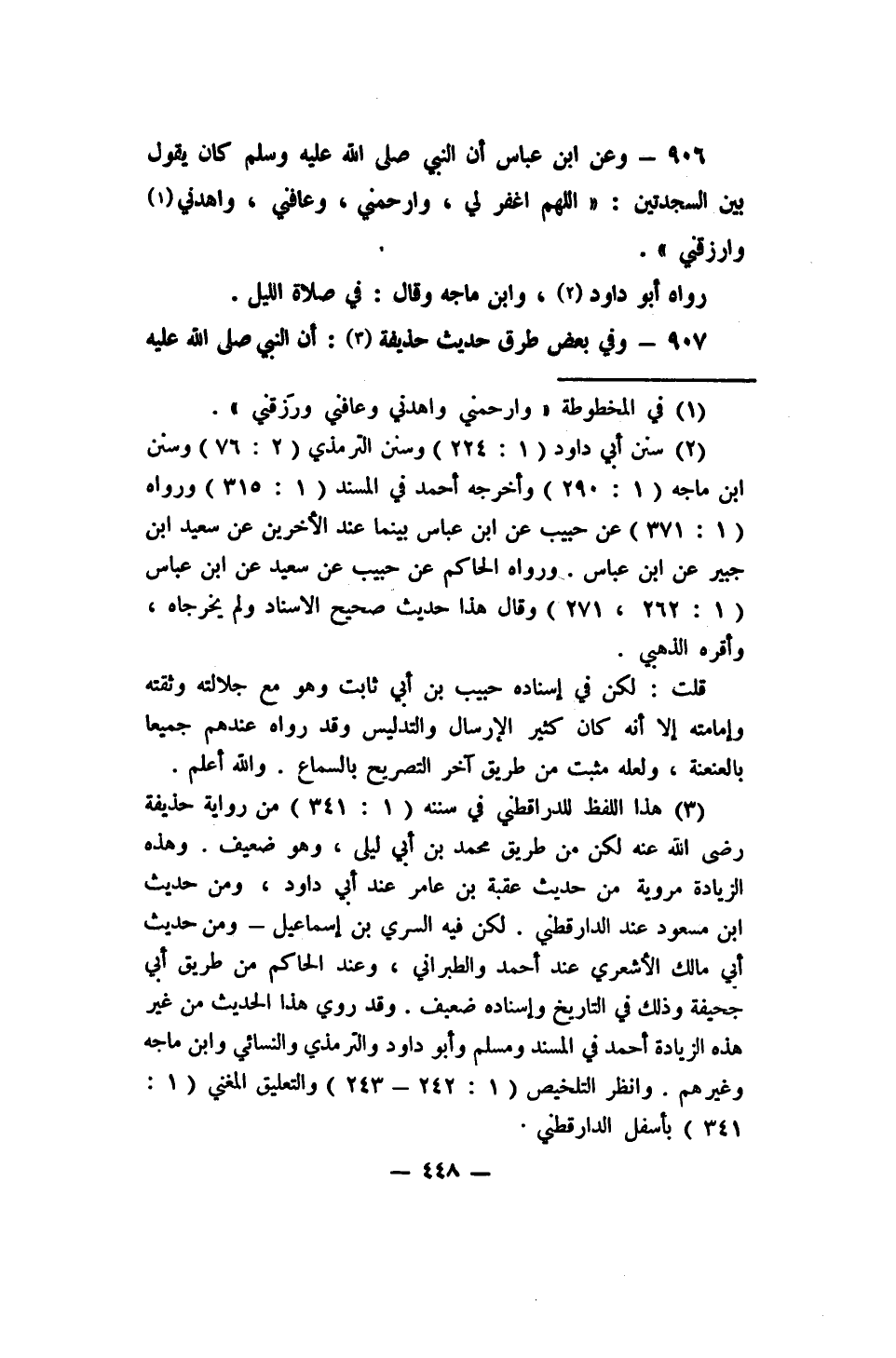 906- وعن ابن عباس: (أن النبي صلى الله عليه وسلم كان يقول بين السجدتين: اللهم اغفر لي، وارحمني، وعافني، واهدني 1 وارزقني) رواه أبو داود، 2 وابن ماجه وقال: في صلاة الليل.