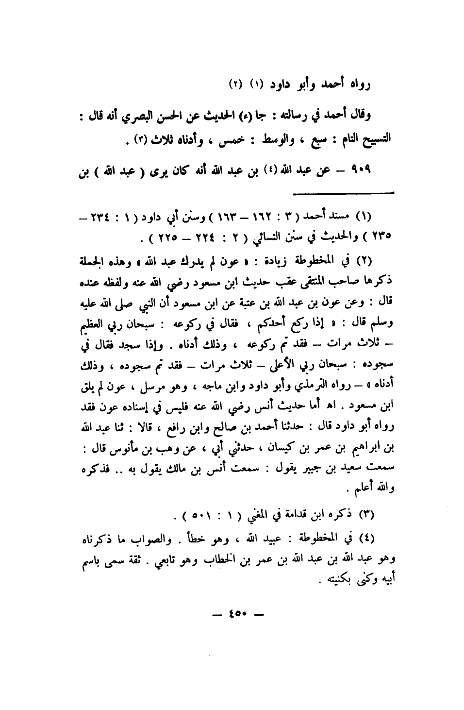 وقال أحمد في رسالته: جا (ء) الحديث عن الحسن البصري أنه قال: (التسبيح التام: سبع، والوسط: خمس، وأدناه ثلاث) 3.