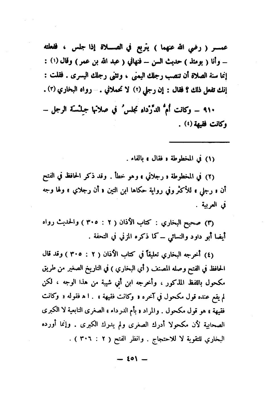 910- وكانت أُمُّ الدَّرْداءِ تجلسُ في صلاتها جِلْسَة الرجل - وكانت فقيهة.4.