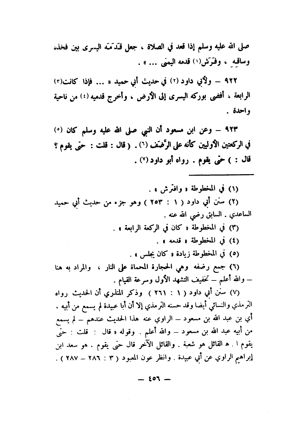 922- ولأبي داود 2 في حديث أبي حميد " ( ... فإذا كانت 3 الرابعة، أفضى بوركه اليسرى إلى الأرض، وأخرج قدميه 4 من ناحية واحدة) .