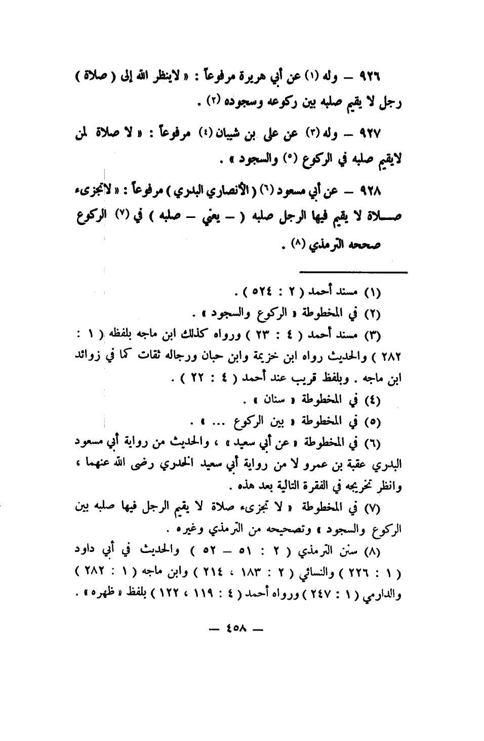 928- عن أبي مسعود 6 (الأنصاري البدري) مرفوعا: (لا تجزئ صلاة لا يقيم فيها الرجل صلبه (- يعني - صلبه) في 7 الركوع.
