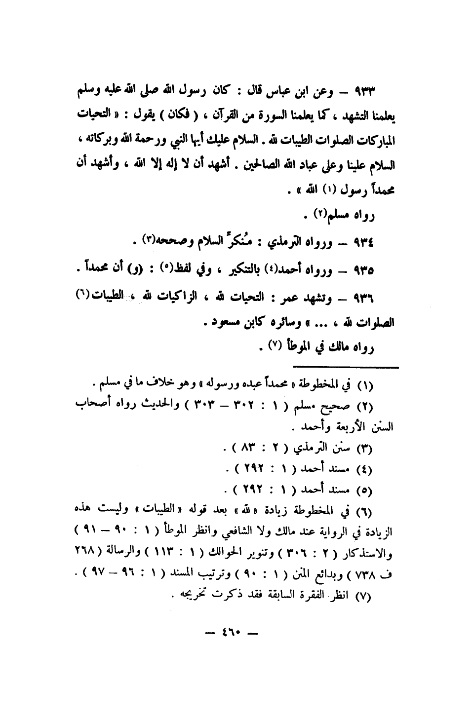 933- وعن ابن عباس قال: (كان رسول الله صلى الله عليه وسلم يعلمنا التشهد، كما يعلمنا السورة من القرآن، (فكان) يقول: التحيات المباركات الصلوات الطيبات لله. السلام عليك أيها النبي ورحمة الله وبركاته، السلام علينا وعلى عباد الله الصالحين. أشهد أن لا إله إلا الله، وأشهد أن محمداً رسول 1 الله) .