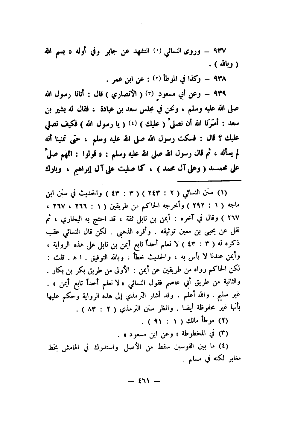 939- وعن أبي مسعودٍ 3 (الأنصاري) قال: (أتانا رسول الله صلى الله عليه وسلم ونحن في مجلس سعد بن عبادة، فقال له بشير بن سعد: أمَرَنا الله أن نصلِّي (عليك) 4 (يا رسول الله) فكيف نصلي عليك؟ قال: فسكت رسول الله صلى الله عليه وسلم حتى تمنينا أنه لم يسأله، ثم قال رسول الله صلى الله عليه وسلم قولوا: اللهم صلِّ على محمد (وعلى آل محمد) ، كما صليت على آل إبراهيم، وبارك