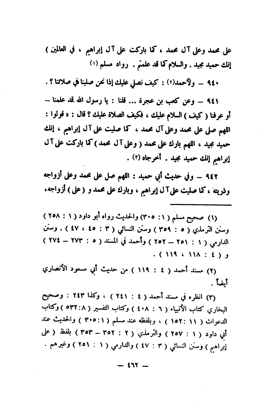 3 انظره في مسند أحمد (4:241) ,وكذا (243) ، وصحيح البخاري: كتاب الأنبياء (6:408) وكتاب التفسير (8: 532) . وكتاب الدعوات (11: 152) , وبلفظه عند مسلم (1: 305) والحديث عند أبي داود (1: 257) والترمذي (2: 352-353) "بلفظ على إبراهيم" وسنن النسائي (3: 47) والدارمي (1: 251) وغيرهم.