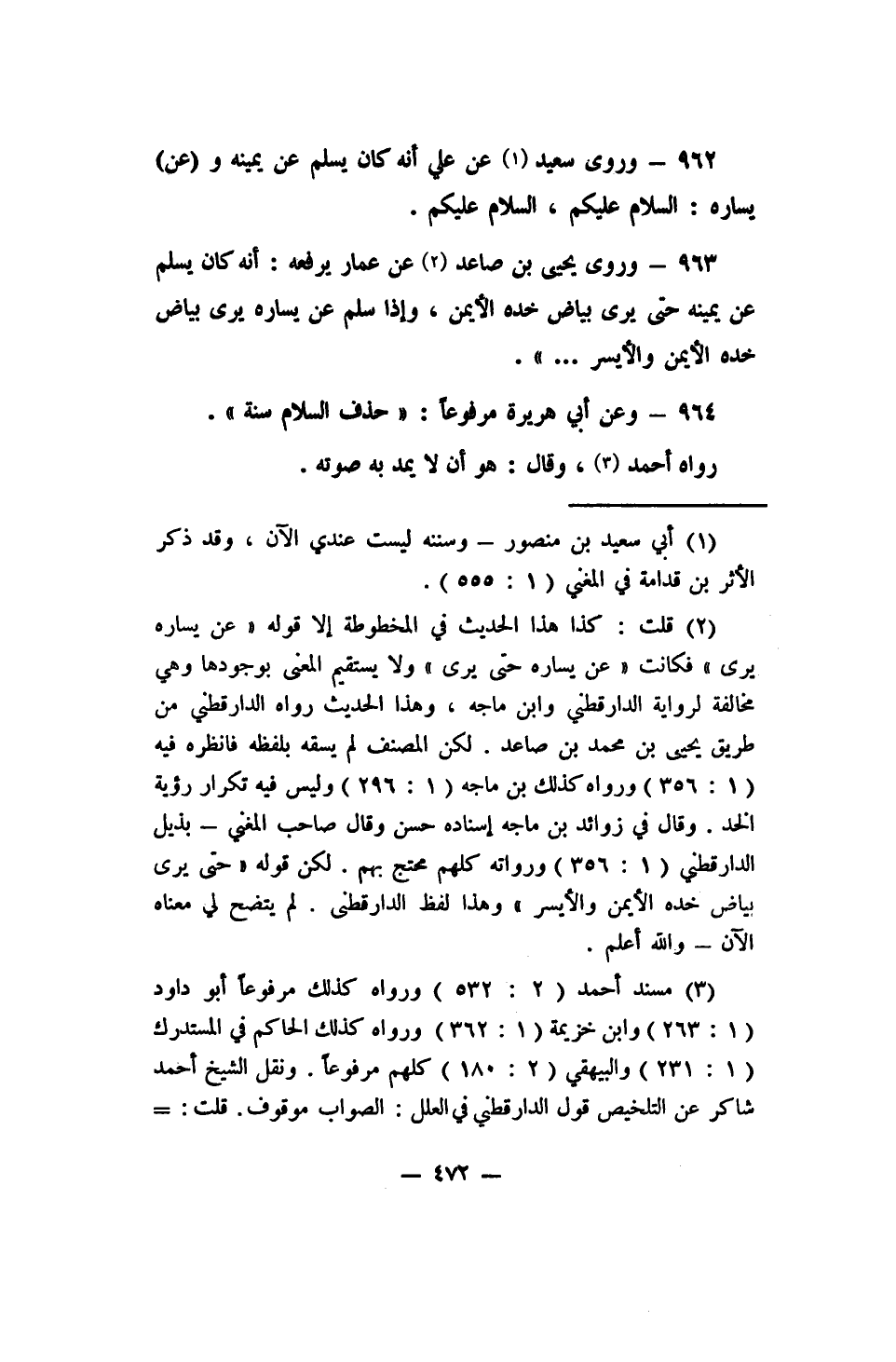 2 قلت: كذا هذا الحديث في المخطوطة إلا قوله "عن يساره يرى" فكانت "عن يساره حتى يرى" ولا يستقيم المعنى بوجودها، وهي مخالفة لرواية الدارقطني وابن ماجه, وهذا الحديث رواه الدارقطني من طريق يحيى بن محمد بن صاعد. لكن المصنف لم يسقه بلفظه فانظره فيه (1: 356) ، ورواه كذلك ابن ماجه (1: 296) وليس فيه تكرار رؤية الخد. وقال في زوائد ابن ماجه: إسناده حسن، وقال صاحب المغني بذيل الدارقطني (1: 356) : ورواته كلهم محتج بهم. لكن قوله "حتى يرى بياض خده الأيمن والأيسر" وهذا لفظ الدارقطني، لم يتضح لي معناه الآن - والله أعلم.