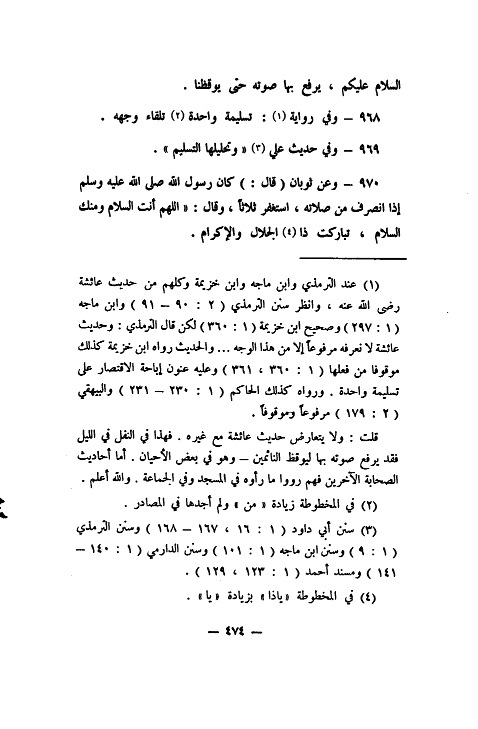 970- وعن ثوبان (قال:) (كان رسول الله صلى الله عليه وسلم إذا انصرف من صلاته، استغفر ثلاثاً، وقال: اللهم أنت السلام ومنك السلام، تباركت ذا 4 الجلال والإكرام) .