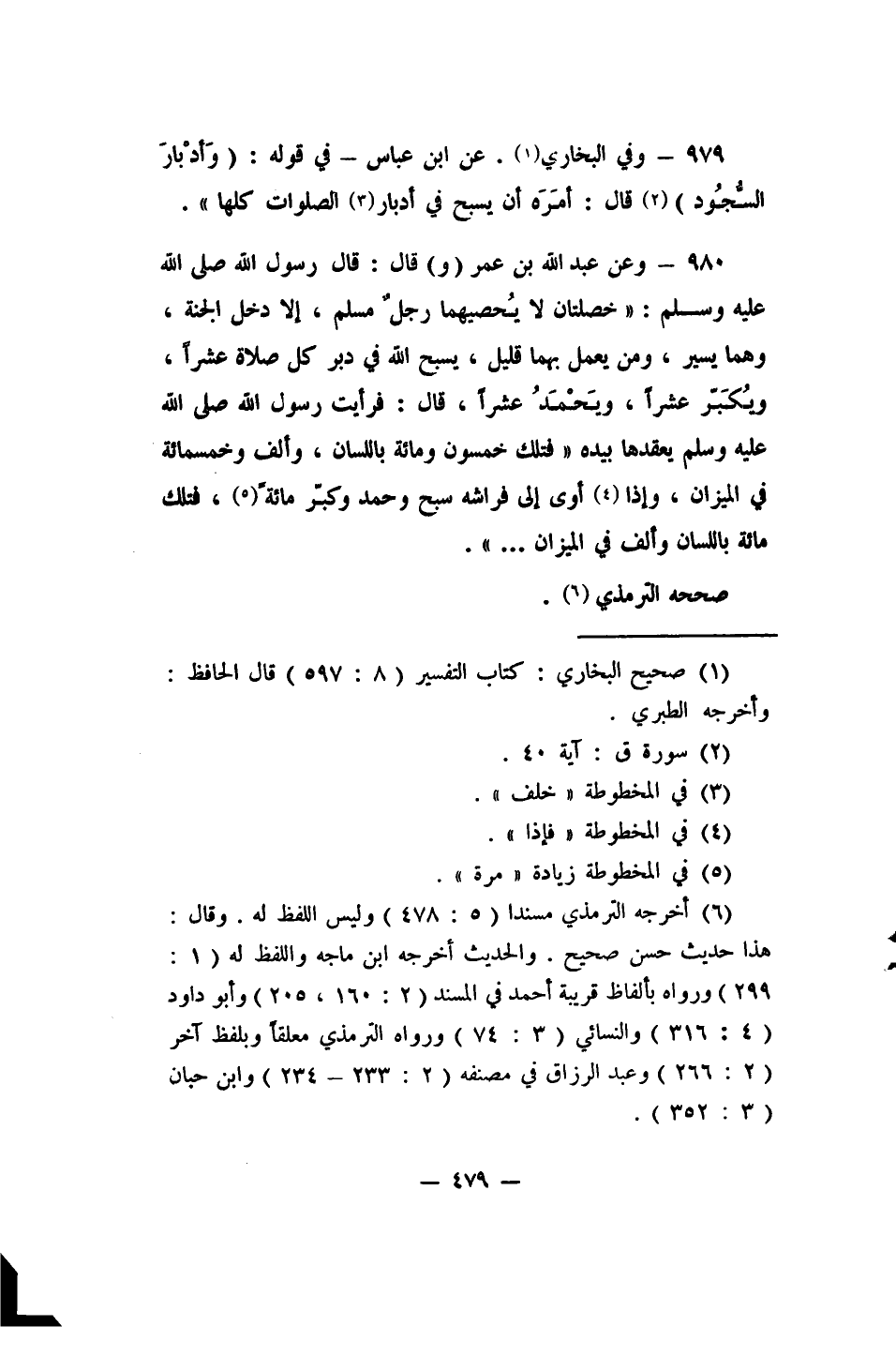 979- وفي البخاري. 1 عن ابن عباس - في قوله: {وأدبار السجود} 2 قال: (أمَرَهُ أن يسبح في أدبار3 الصلوات كلها) .