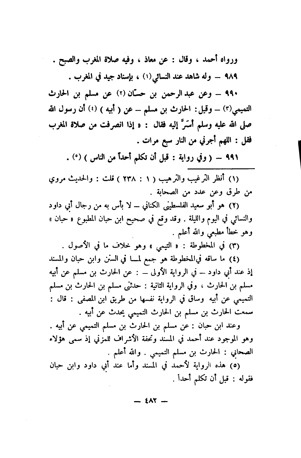 990- وعن عبد الرحمن بن حسّان 2 عن مسلم بن الحارث التميمي 3 - وقيل: الحارث بن مسلم - عن (أبيه) 4 أن رسول الله صلى الله عليه وسلم أسرَّ إليه فقال: (إذا انصرفت من صلاة المغرب فقل: اللهم أجرني من النار سبع مرات) .