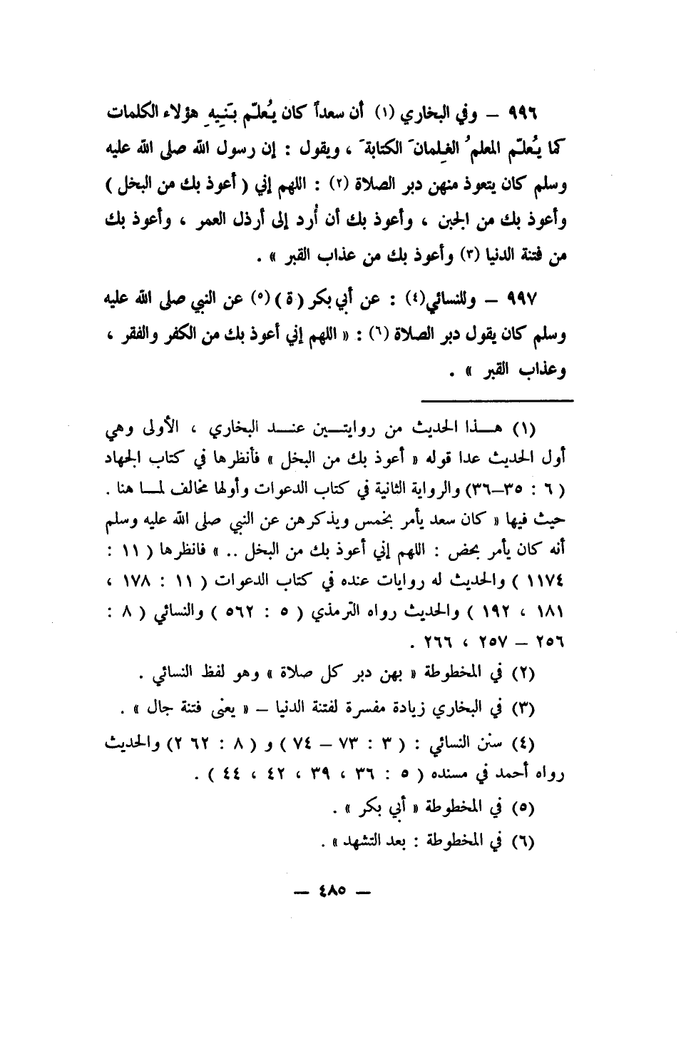996- وفي البخاري 1 أن سعداً كان يُعلِّمُ بَنِيهِ هؤلاء الكلمات كما يعلِّم الْمُعلِّمُ الغِلمانَ الكتابةَ، ويقول: (إن رسول الله صلى الله عليه وسلم كان يتعوذ منهن دبر الصلاة:2 اللهم إني (أعوذ بك من البخل) وأعوذ بك من الجبن، وأعوذ بك أن أُرَدَّ إلى أرذل العمر، وأعوذ بك من فتنة الدنيا 3 وأعوذ بك من عذاب القبر) .