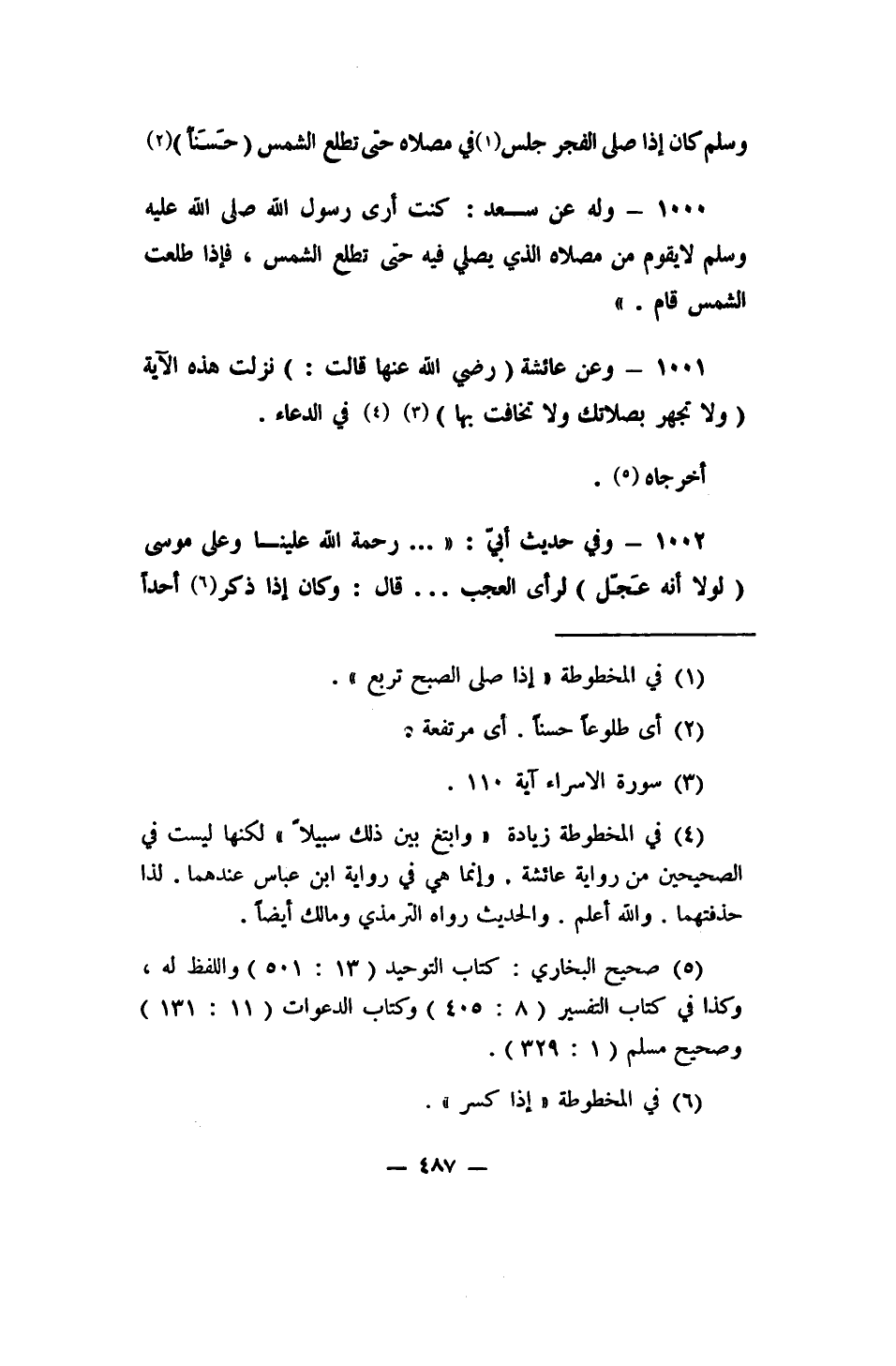 1000- وله عن سعد: (كنت أرى رسول الله صلى الله عليه وسلم لا يقوم من مصلاه الذي يصلي فيه حتى تطلع الشمس، فإذا طلعت الشمس قام) .